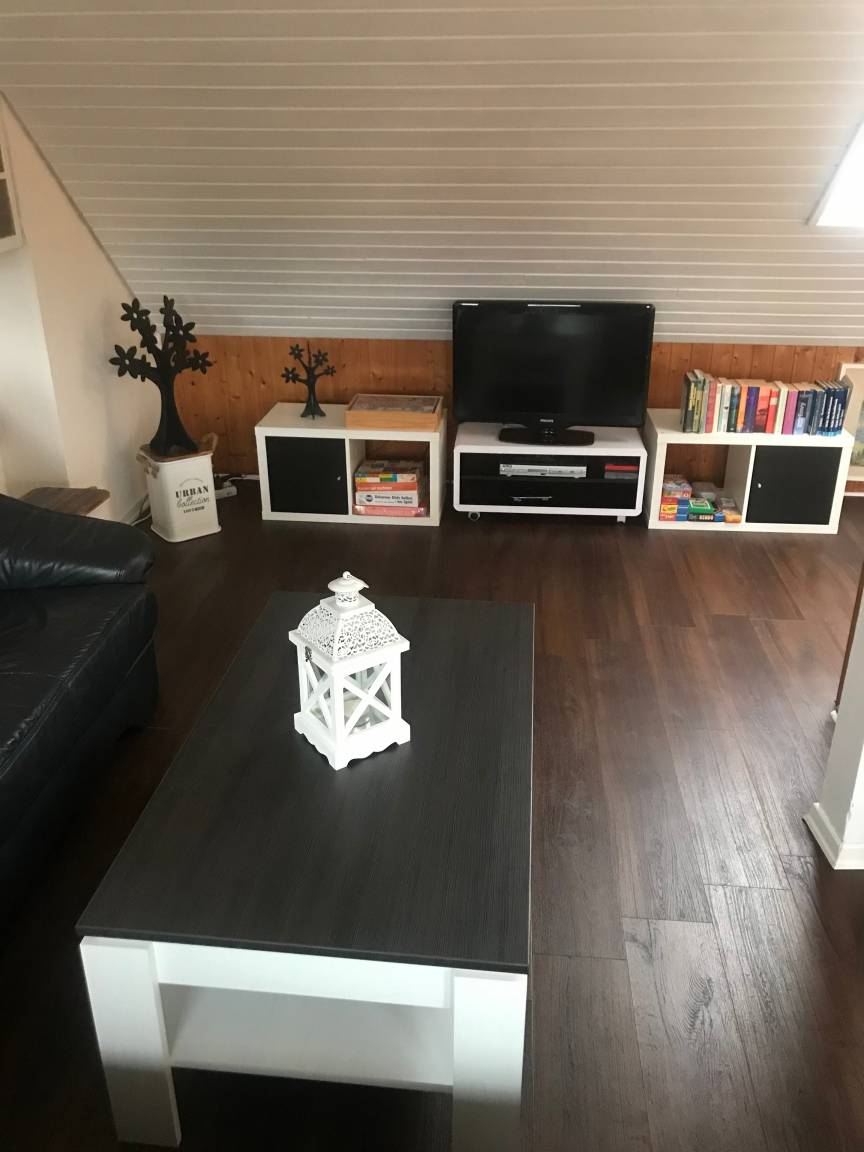 Eine Treppe führt ins Dachgeschoss mit dem kombinierten Wohn-/Schlafraum: rechts der Schlafbereich mit einem Doppelbett (180 x 200 cm), links der Wohnbereich mit gemütlicher Sitzecke und Fernseher. Bitte beachten Sie, dass der Receiver ausschließlich auf die öffentlich rechtlichen Sender ( ARD, ZDF, 3-Sat , KiKa .. ) programmiert ist. Des Weiteren steht ein DVD-Player bereit.