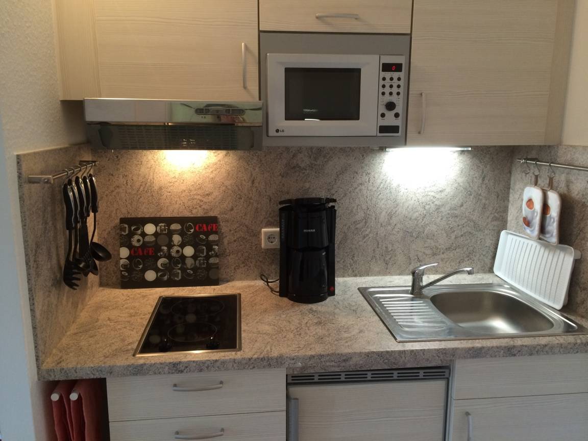 In der Küche finden Sie neben einem 2-Platten-Herd und einer Mikrowelle, auch eine Kaffeemaschine, einen Wasserkocher und einen Toaster sowie einen Kühlschrank mit Gefrierfach.