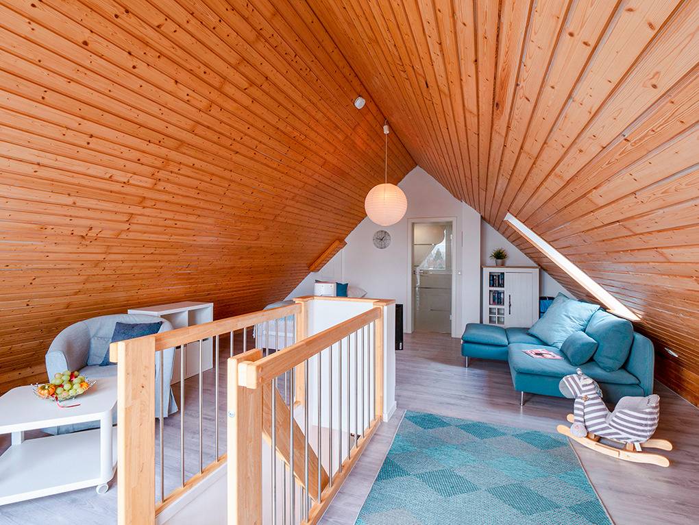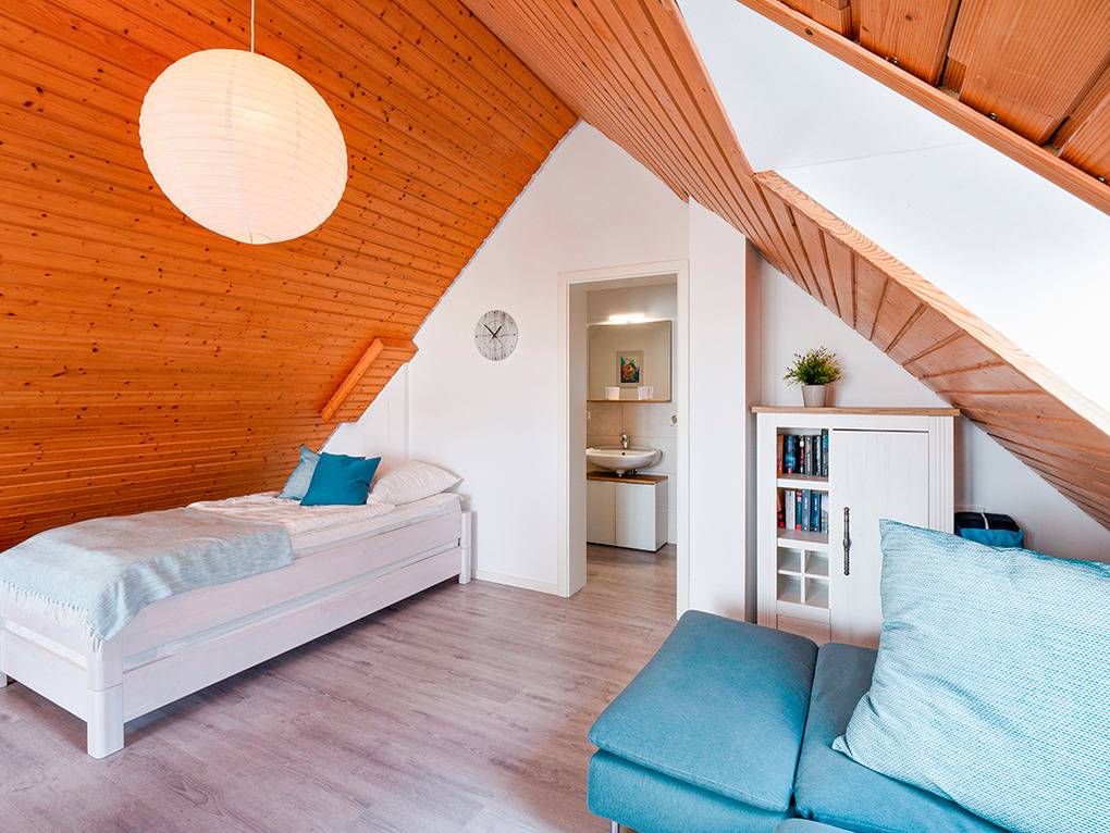 D 167.14 Wohnung 2-4 Pers.: 3-Zimmerwohnung mit 63 qm Wohnfläche über 2 Etagen. 1. Etage: Schöner Wohn-/Essraum mit Sitzgruppe, Smart-Sat-TV, Radio/CD, Esstisch, moderner Einbauküche (Backofen, Spülmaschine), Balkon. Doppelzimmer mit Balkon. Bad/WC. Vom Wohnraum steile Raumspartreppe ins ausgebaute Dachgeschoss (keine Kindersicherung, Schrägen): Offener Wohn-/Schlafraum mit gemütlicher Sitzecke, Sat-TV, zwei stapelbaren Einzelbetten. Separates WC, Wb.
