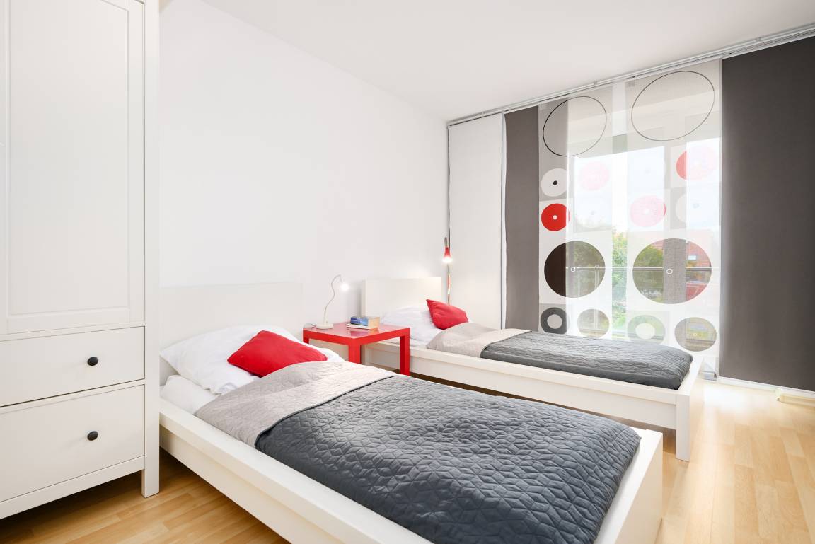 Schlafzimmer 2: 2 Einzelbetten (je 90x200 cm), Kleiderschrank, Verdunkelung: Gardine, Platz für Babybett vorhanden