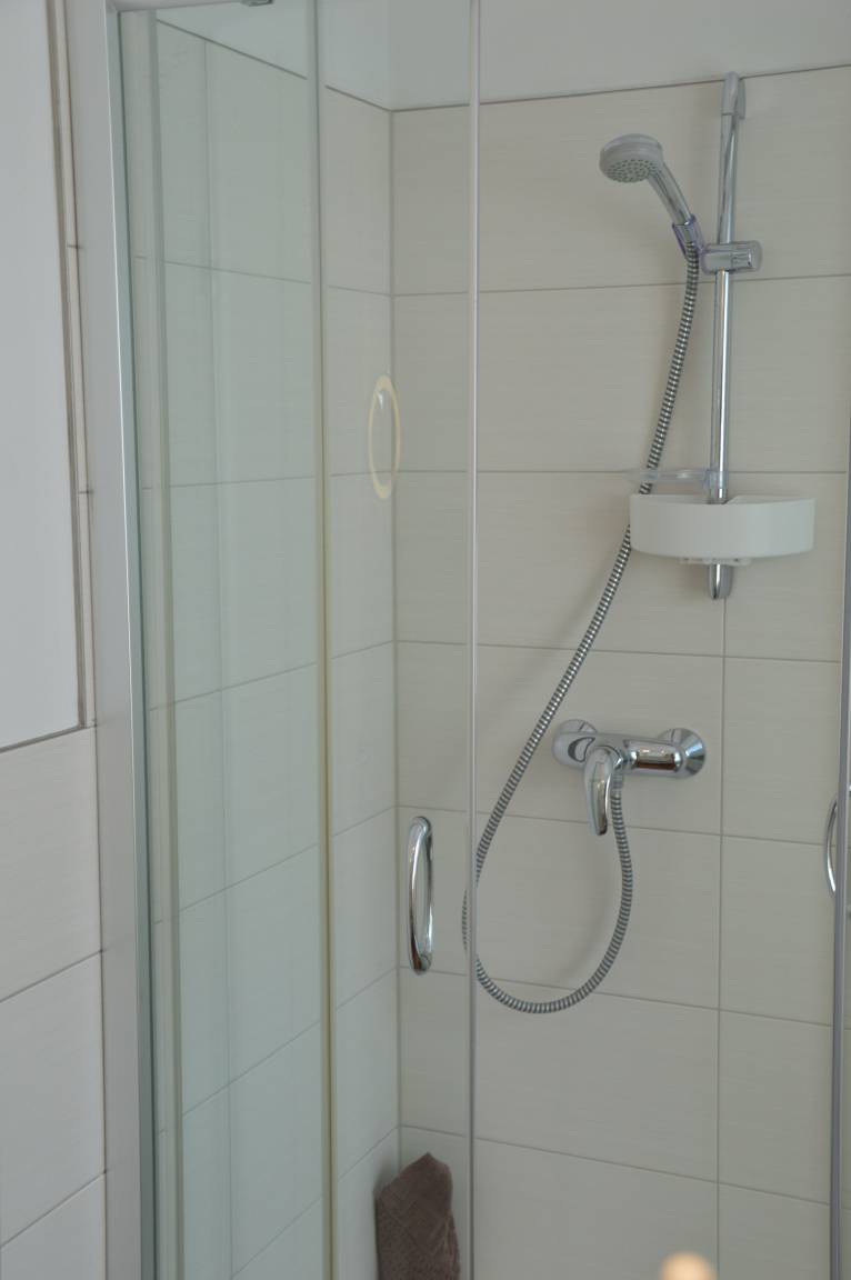 Das helle Badezimmer ist mit einer Dusche, einem WC und einem Waschbecken ausgestattet. Für Ihre Badartikel sind ausreichend Ablagemöglichkeiten vorhanden. Außerdem finden Sie einen Föhn, einen Schminkspiegel und einen Hocker vor.