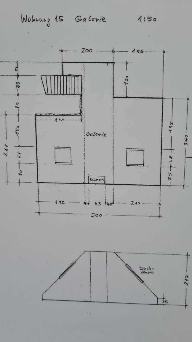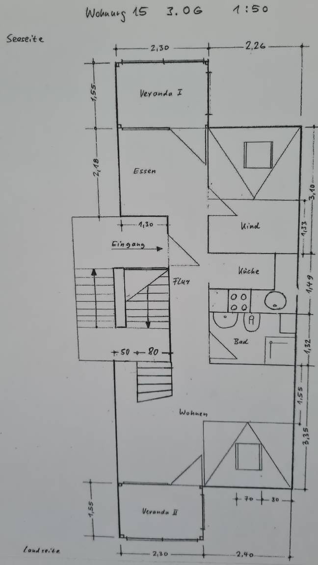 Das Appartement ist auf zwei Eben verteilt: Im unteren Bereich befinden sich ein Wohnzimmer, das Kinder-Schlafzimmer (5,4 m², Bett 140 x 200 cm), der Essbereich sowie die Küche (offen zum Flur und Wohnzimmer) und das Duschbad (2,9 m²).