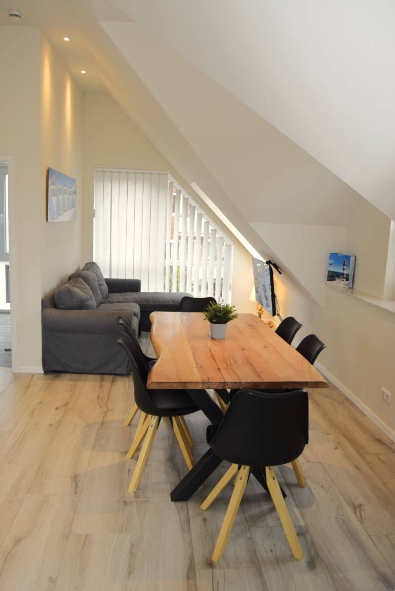 In unserem schönen Ferienhaus "Haus Kaptain" direkt hinter dem Deich ist das die tägliche Erholung. Die großen Fenster sorgen für ein lichtdurchflutetes Obergeschoss mit Wohnzimmer, Essbereich und offener Küche für geselliges Beisammensein.