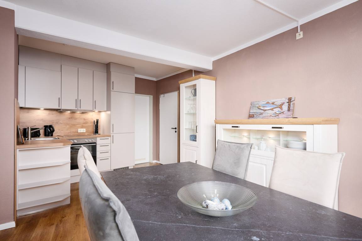Der helle Wohnbereich lädt mit einem komfortablen Sofa und Fernseher zu entspannten Stunden ein. Von hier gelangen Sie direkt auf den Balkon, der Ihnen mit gemütlichen Sitzmöglichkeiten einen wunderbaren Platz zum Verweilen bietet. Die offene Küche ist mit Backofen, Geschirrspülmaschine, Kühlschrank, Cerankochfeld und Kaffeemaschine bestens ausgestattet und grenzt an den Essbereich, der zum gemeinsamen Genießen Ihrer Mahlzeiten einlädt. Im Schlafzimmer mit Meerblick sorgt ein bequemes Doppelbett (ca. 160x200 cm) für erholsamen Schlaf. Das moderne Badezimmer verfügt über eine ebenerdige Dusche und WC.