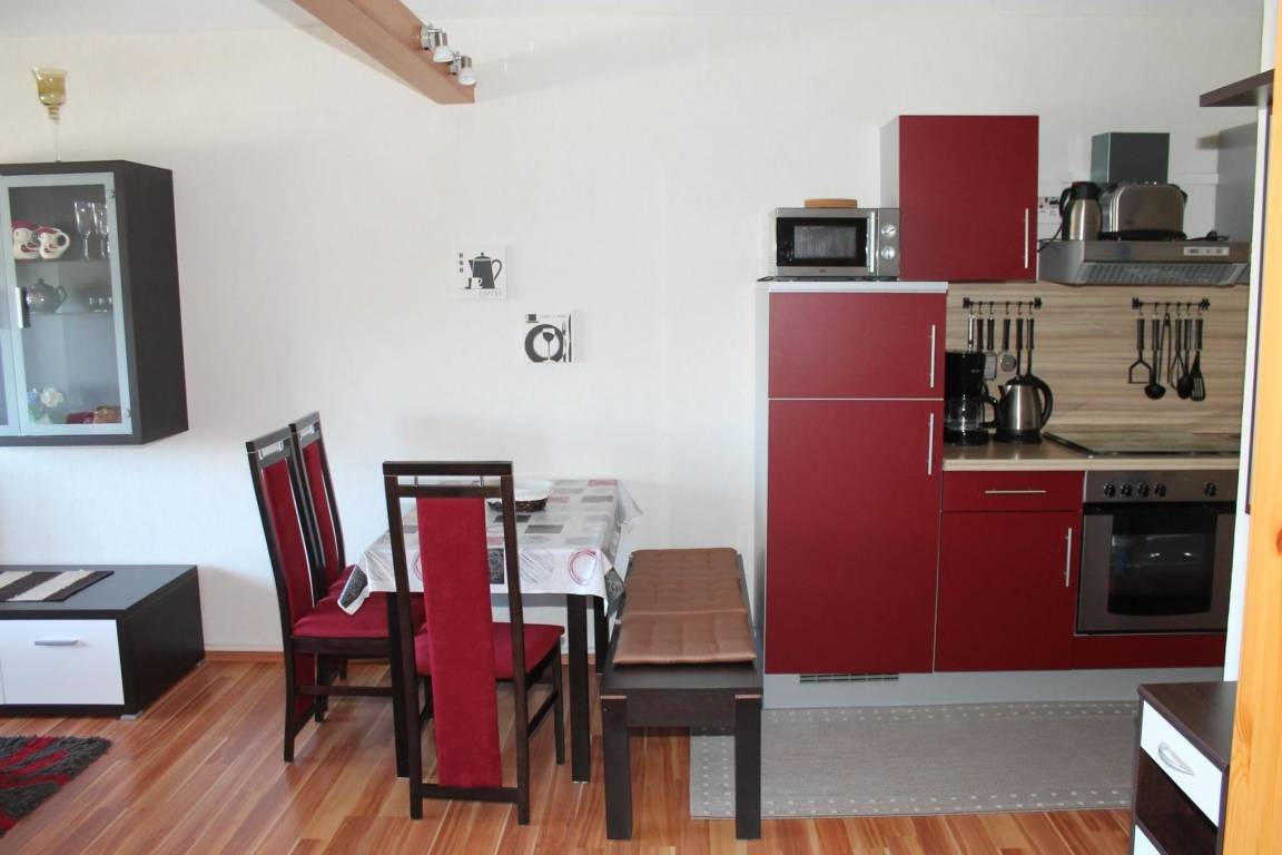 Die komplett ausgestattete Einbauküche eröffnet alle Möglichkeiten zur Selbstversorgung und zum Essen in der ansprechenden Essecke.