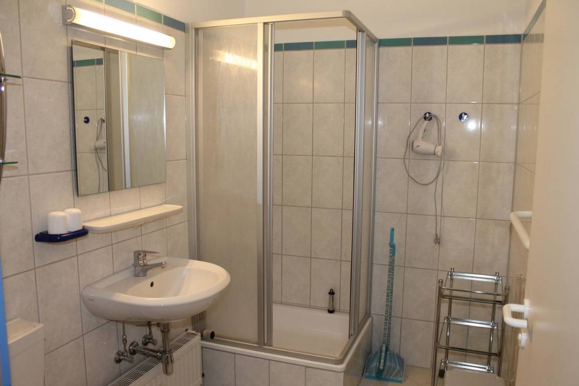 Das Badezimmer ist mit Dusche, Föhn und WC ausgestattet.