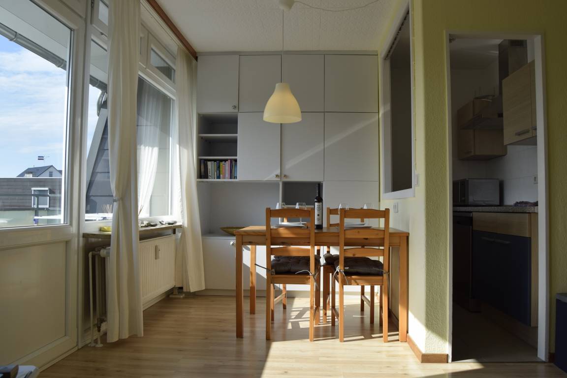 Zum Apartment: Der Eingang befindet sich ebenerdig im Haus 5a. Ihr Fahrzeug parken Sie bitte auf dem Stellplatz 29. Das Apartment selbst befindet sich im 2. Stockwerk, Richtung Seeseite. Es verfügt über 52 qm, aufgeteilt auf ein Eltern Schlafzimmer (8 qm) mit Doppelbett (1,40 x 2,00), ein (Kinder-) Zimmer (9 qm) mit Stockbett (je 0,90 x 2,00) sowie ein großzügiges Wohnzimmer mit Schlafcouch (ebenfalls 1,40 x 2,00 Liegefläche). Alle Zimmer haben – z.T. seitlichen – Meerblick, das Wohnzimmer verfügt über einen nicht einsehbaren Balkon, ebenfalls mit seitlichem Blick zur Ostsee, die gerade mal 200m entfernt ist. Auf dem Balkon in Südwestlage können Sie die Nachmittags- und Abendsonne genießen. Im Wohnzimmer gibt es eine Essecke mit Durchreiche zur voll ausgestatteten Küchenzeile mit Geschirrspüler, Senseo Kaffeeautomat, Kaffeemaschine, Toaster etc. Backofen mit Grill und Mikrowelle ist vorhanden.