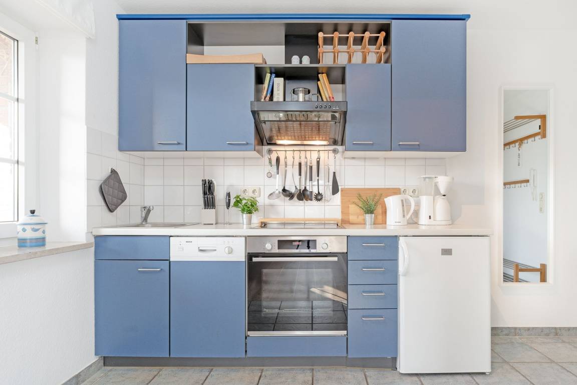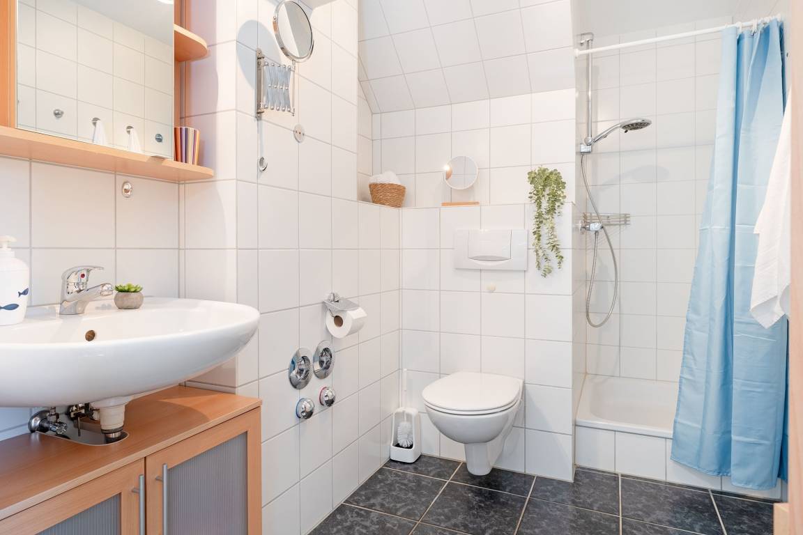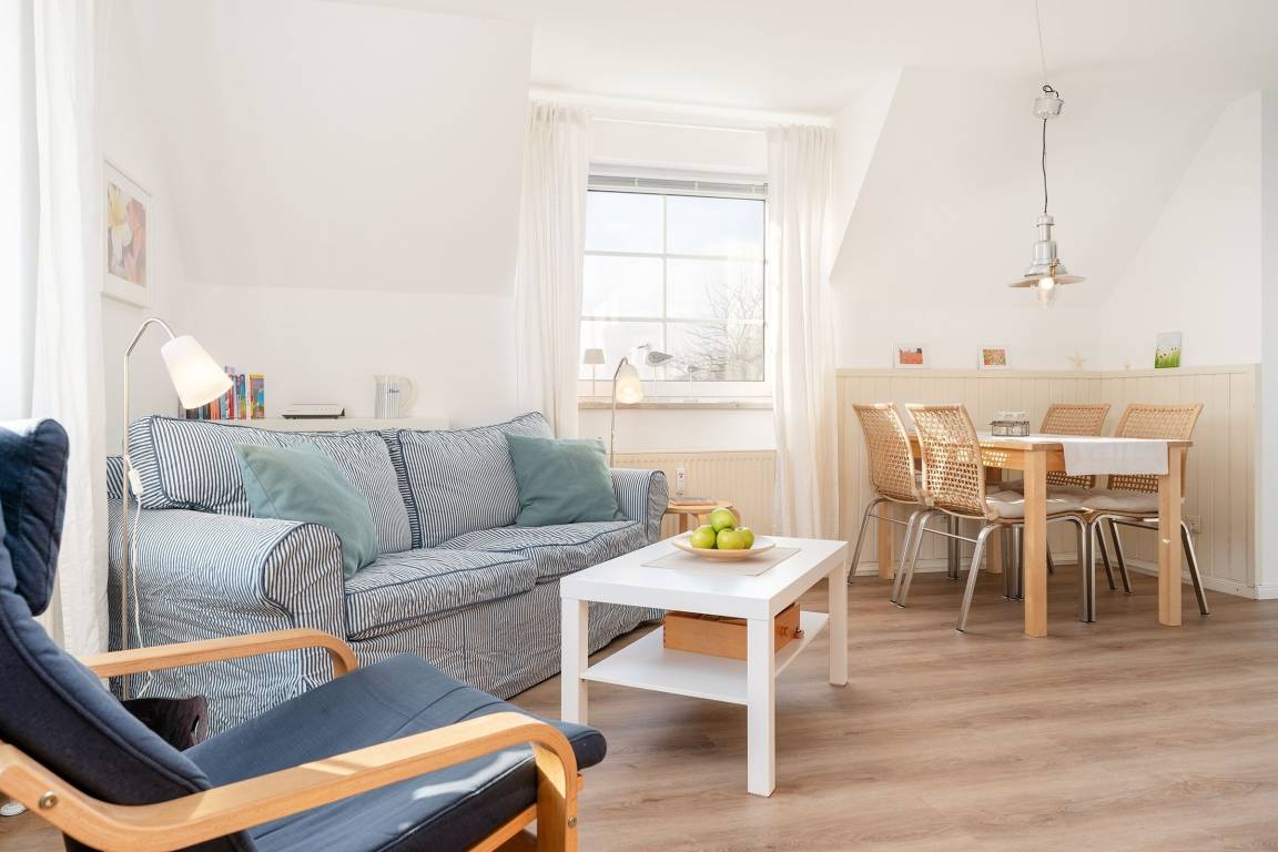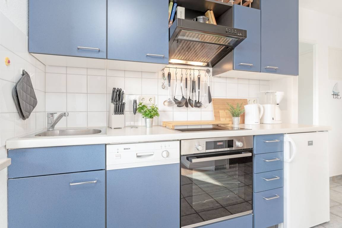 Nur rund 250 Meter vom Strand entfernt lädt Sie die zauberhafte Ferienwohnung Strandblume mit einem gemütlich eingerichteten Wohnbereich zum Entspannen ein. Vom möblierten Balkon aus haben Sie einen schönen Blick ins Grüne – und können die gesunde Seeluft genießen. Wie wäre es mit einem Rezept aus der Region? Die moderne, zum Wohnbereich hin offene Küche ist mit Induktionsherd und Geschirrspüler sehr gut ausgestattet und sorgt sicher für Freude beim Kochen. In dem einen Schlafzimmer steht ein Doppelbett (2x 90x200 cm) für einen erholsamen Schlaf bereit, in dem anderen befinden sich 2 Einzelbetten (je 90x200 cm), die auch zu einem Doppelbett zusammengeschoben werden können. Beide Räume verfügen jeweils über Rollo und Fliegengitter. Das innenliegende Duschbad punktet mit einer angenehmen Fußbodenheizung. Für Unterhaltung sorgen der kostenfreie WLAN-Zugang sowie eine Marshall Bluetooth-Box. Ein Gemeinschaftsgarten mit Tischtennisplatte runden das Angebot ab.