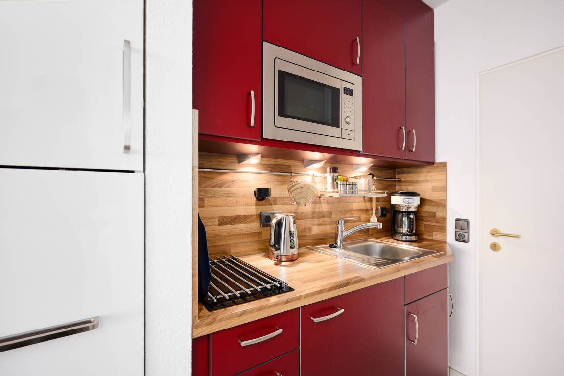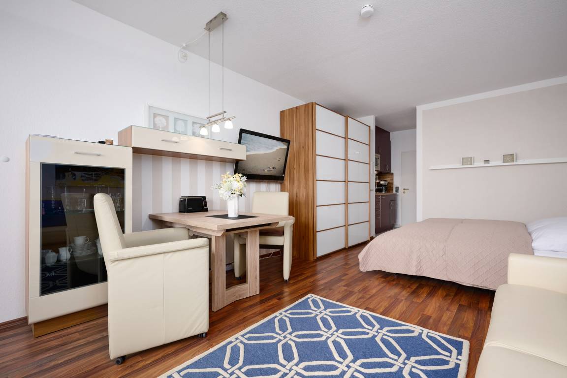 Der kombinierte Wohn- und Schlafbereich ist freundlich eingerichtet und bietet alles, was Sie für einen erholsamen Aufenthalt benötigen. Ein bequemes Doppelbett sorgt für erholsame Nächte, während der Wohnbereich mit Fernseher und gemütlicher Sitzecke zum Entspannen einlädt. Von hier aus gelangen Sie auf den Balkon, der einen schönen Rückzugsort im Freien bietet, ideal für ein Frühstück in der Sonne oder einen entspannten Ausklang am Abend. Die kleine Küche ist gut ausgestattet mit einem Kombigerät Mikrowelle/ Backofen, Kühlschrank mit Gefrierfach, Wasserkocher, Filterkaffeemaschine und Toaster, sodass Sie problemlos Ihre Mahlzeiten selbst zubereiten können. Das Badezimmer verfügt über eine Dusche, WC, Haartrockner sowie Kosmetikspiegel und bietet somit allen nötigen Komfort.