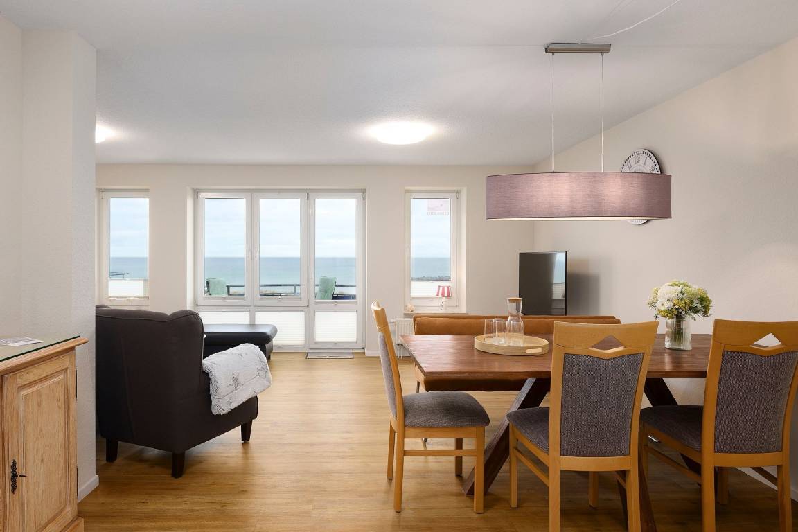 In traumhafter Lage direkt in 1. Reihe am Schönberger Strand befindet sich im 1. OG die 3-Zimmer-Ferienwohung Störtebecker mit einem wunderschönen Meerblick. Die Wohnfläche von ca.72 m² verteilt sich auf zwei Schlafzimmer, Duschbad und ein Wohnzimmer mit offener Küche und Essbereich und eignet sich hervorragend für einen Urlaub bis zu 4 Personen.