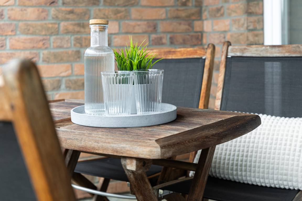 Der helle Wohnbereich ist modern möbliert und verfügt über eine gemütliche Sitzecke und TV. Große Fenster sorgen für ein angenehmes Raumgefühl. Vom Wohnbereich gelangen Sie auf den überdachten Süd-Balkon mit Gartenmöbeln und Markise – ideal, um die Sonne zu genießen oder den Abend entspannt ausklingen zu lassen.