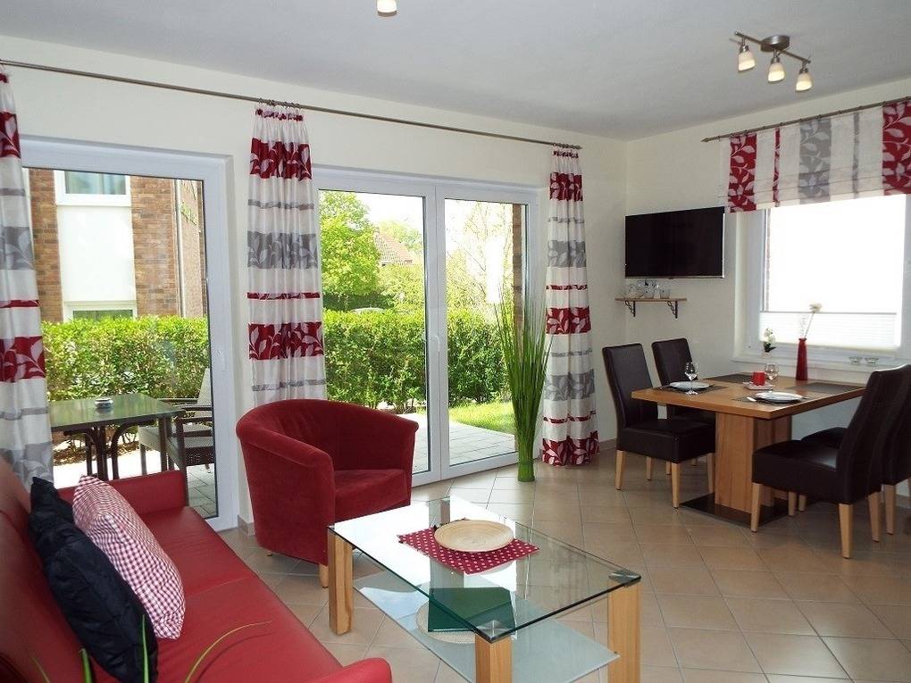 Das Appartement für 4 Personen ausgestattet. die Wohnfläche von ca. 47 qm besteht aus einem großen Wohnzimmer mit gemütlicher Schlafcouch, einer komplett eingerichteten Küchenzeile, einem Schlafzimmer, einem Duschbad mit Handtuchheizung und einer Diele auf. Die komplette Wohnung verfügt über Fußbodenheizung, alle Fenster sind mit Außenjalousien ausgestattet. Eine große Südterrasse - ca. 12 qm - mit Gartenmöbeln runden das Angebot ab. Zur Wohnung gehört ein abschließbarer Abstellraum für Fahrräder, Bollerwagen, usw. sowie ein für Sie reservierter Kfz-Stellplatz.
