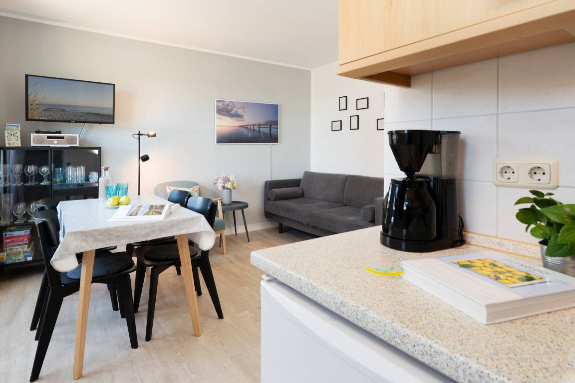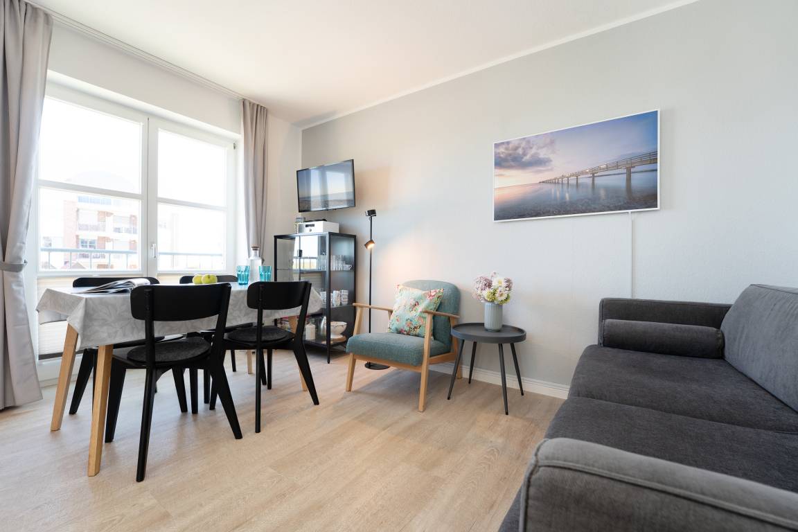 Verbringen Sie gemeinsame Stunden im Wohnbereich mit integrierter Küche und lassen Sie den Tag mit einem Glas Wein auf dem sonnigen Balkon ausklingen. Die Schlafzimmer sind mit einem Doppelbett, zwei Einzelbetten und zwei Kleiderschränken ausgestattet. Im hellen Duschbad starten Sie erfrischt in den neuen Tag. WLAN ist hier natürlich auch inklusive. Alle Fenster sind mit Fliegenschutzgittern ausgestattet, sodass Sie jederzeit die frische Ostseeluft hereinlassen können.