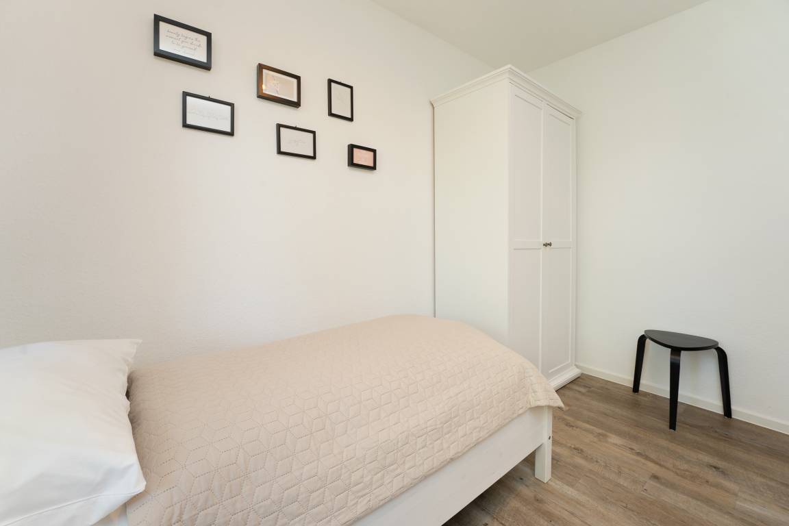 Schlafzimmer 2: 2 Einzelbetten (je 90x200 cm), Kleiderschrank, Verdunkelung: Gardinen