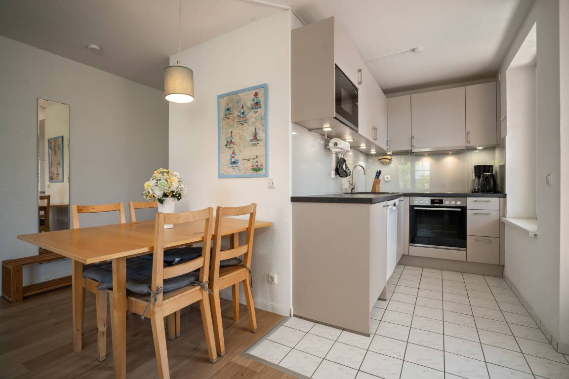 Auf einer Wohnfläche von ca. 65 m² verteilen sich ein Wohnzimmer mit intergrierter Küchenzeile und Essbereich, ein Duschbad und zwei separate Schlafzimmer im Dachgeschoss, die mit einem Doppelbett (2x 90x200 cm) und zwei Einzelbetten (je 90x200 cm) ausgestattet sind.