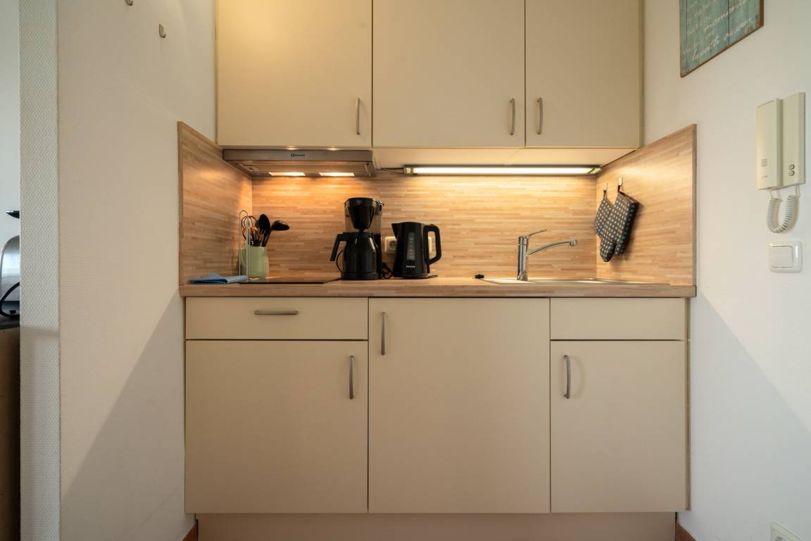 Die Wohnung bietet ein Doppelbett (180x200 cm) und Einbauschrank, gemütliche Sitzplätze zum Lesen, separate Sitzplätze zum Essen, einen Flachbildschirm-TV mit Apple TV, iPhone Ladekabel und Hifi-Anlage. Das Badezimmer verfügt über eine Dusche mit WC. Die Küchenzeile ist ausgestattet mit einer 2-Platten-Herdplatte, für Frühstück stehen sowohl Toaster als auch Kaffeemaschine/ Wasserkocher bereit. Ihre Abende lassen sich gut auf dem eigenen Balkon ausklingen.