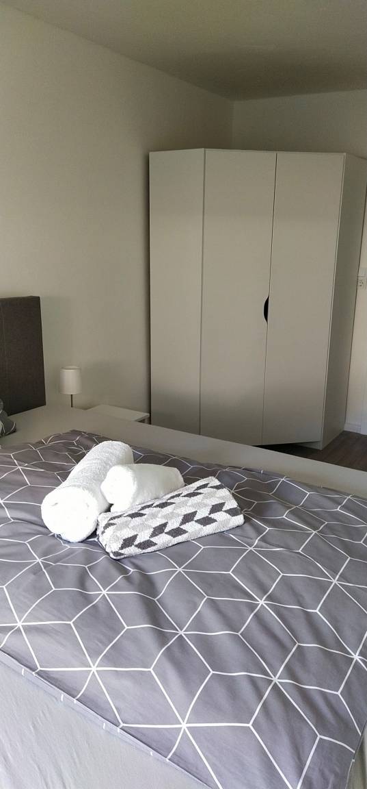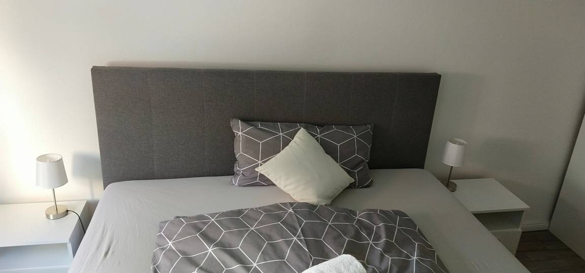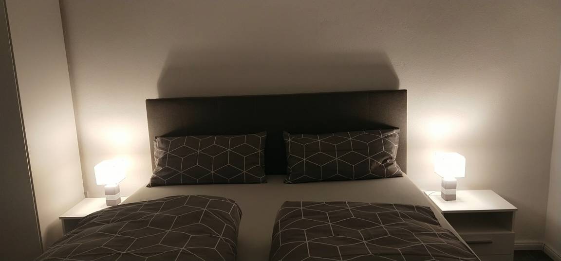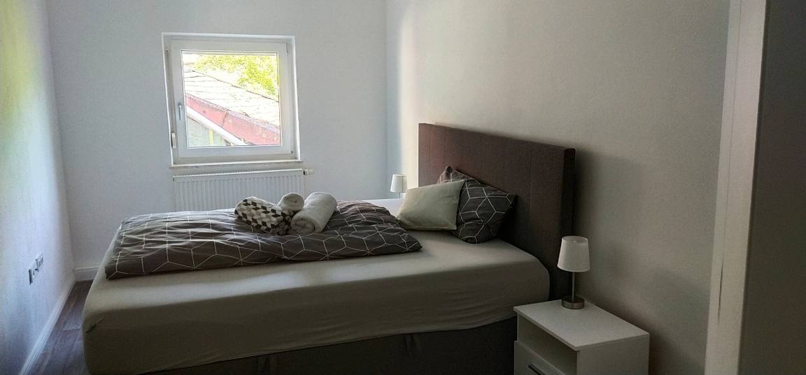 Die 84qm große Ferienwohnung ist in der 1. Etage. Alle Schlafzimmer sind mit einem 180 cm breiten Boxspringbett ausgestattet und sind auf der Gartenseite. Das größere Schlafzimmer verfügt über Smart TV , Schreibtisch und Balkon.