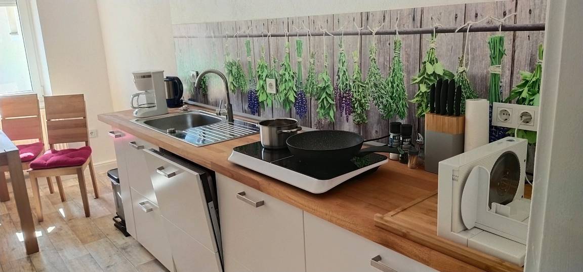 In der Küche ist ein portables Steckdosenradio und ein portables zweier Induktionskochfeld. Der Backofen ist erhöht eingebaut und natürlich ist auch ein Geschirrspüler und eine Mikrowelle vorhanden. Brotschneidemaschine, Mixer, Küchenwaage, Kaffeemaschine und Toaster sind natürlich Bestandteile der Küche. Die Sitzecke lädt zu den Mahlzeiten ein oder auch nur zum Relaxen.