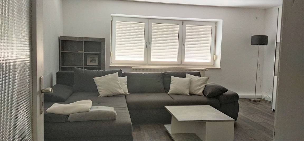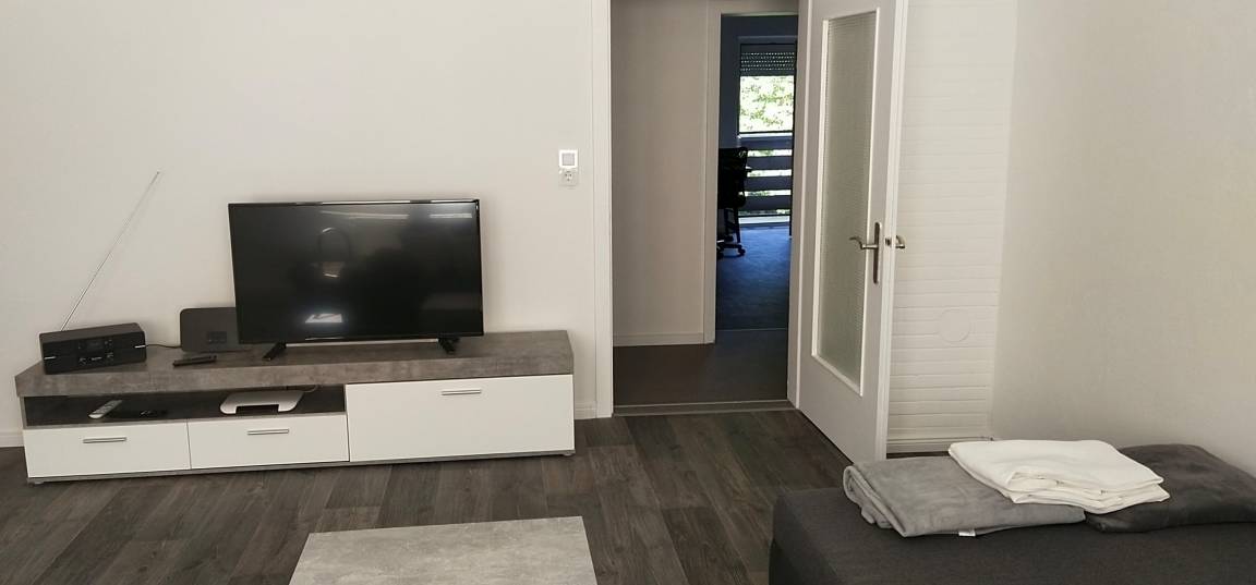 Das Wohnzimmer ist mit einer großen Schlafcouch, Smart TV mit Magenta TV und DAB Radio ausgestattet.