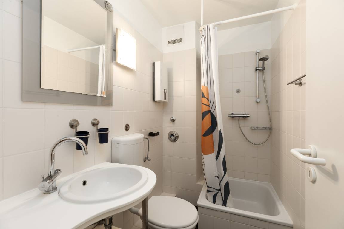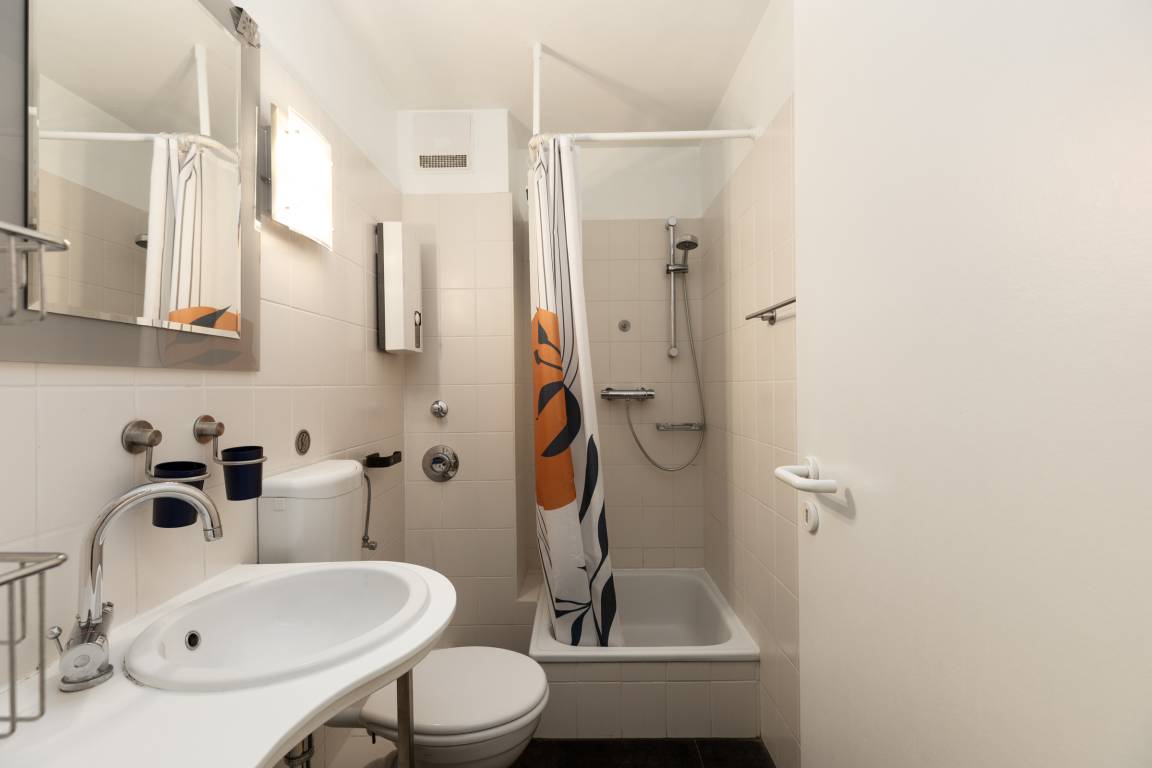 Wohn-/ Schlafzimmer: 1 Schlafsofa (160x200 cm), Kleiderschrank, TV, Verdunkelung: Gardine, kein Platz für ein Babybett vorhanden