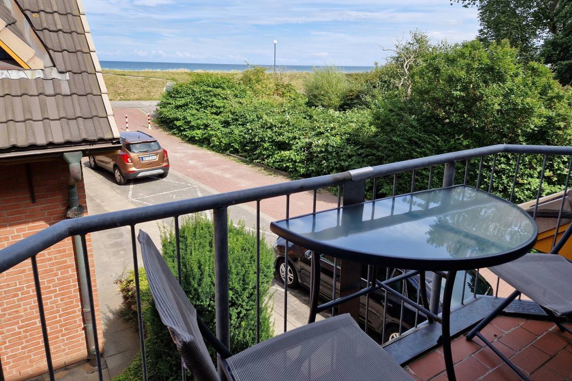 Ein kleiner Balkon mit 2 Stühlen und einem Tisch lädt zum Blick über den Deich auf die Ostsee ein.