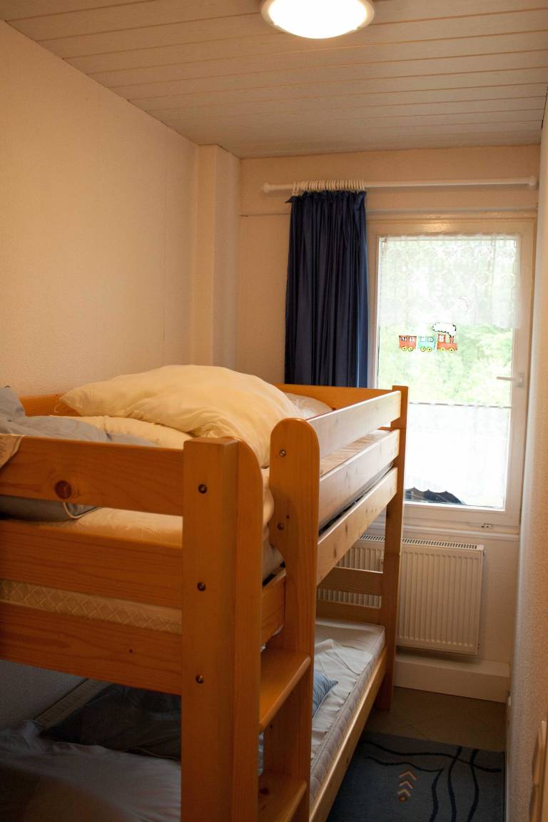 Bei der Renovierung entstanden ist ein großzügiger, heller Wohnraum mit einem Schlafsofa und im Schlafzimmer ein Doppelbett und ein zusätzliches Doppelhochbett.