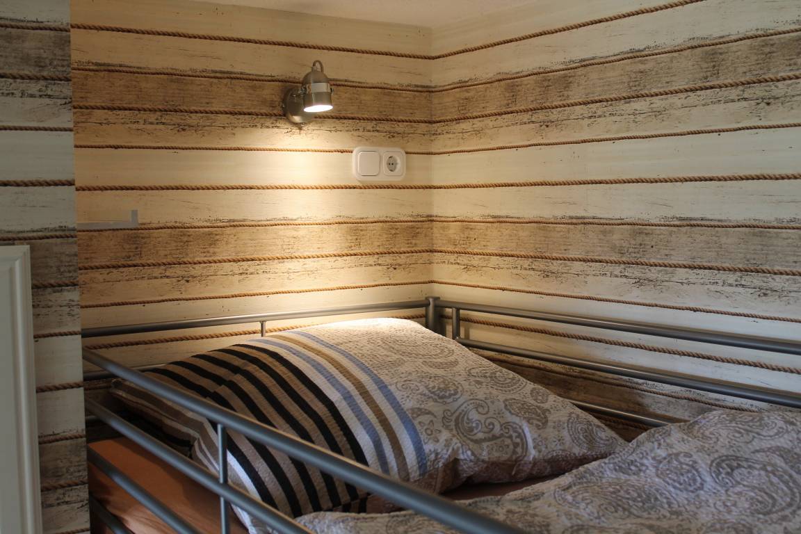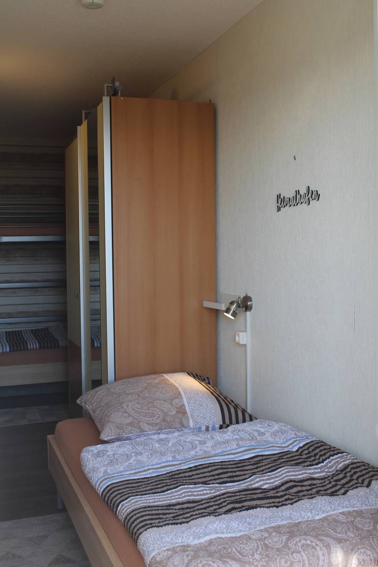 Im separaten Schlafzimmer befinden sich 3 Betten. Neben einem stabilen Etagenbett sowie einem Einzelbett findet man hier auch einen Kleiderschrank mit Spiegel und Schubladen, sowie Unterbettkommoden. Für das mitgebrachte Reisegepäck ist somit ausreichend Platz vorhanden.