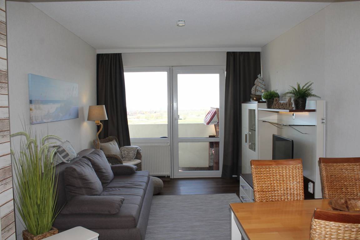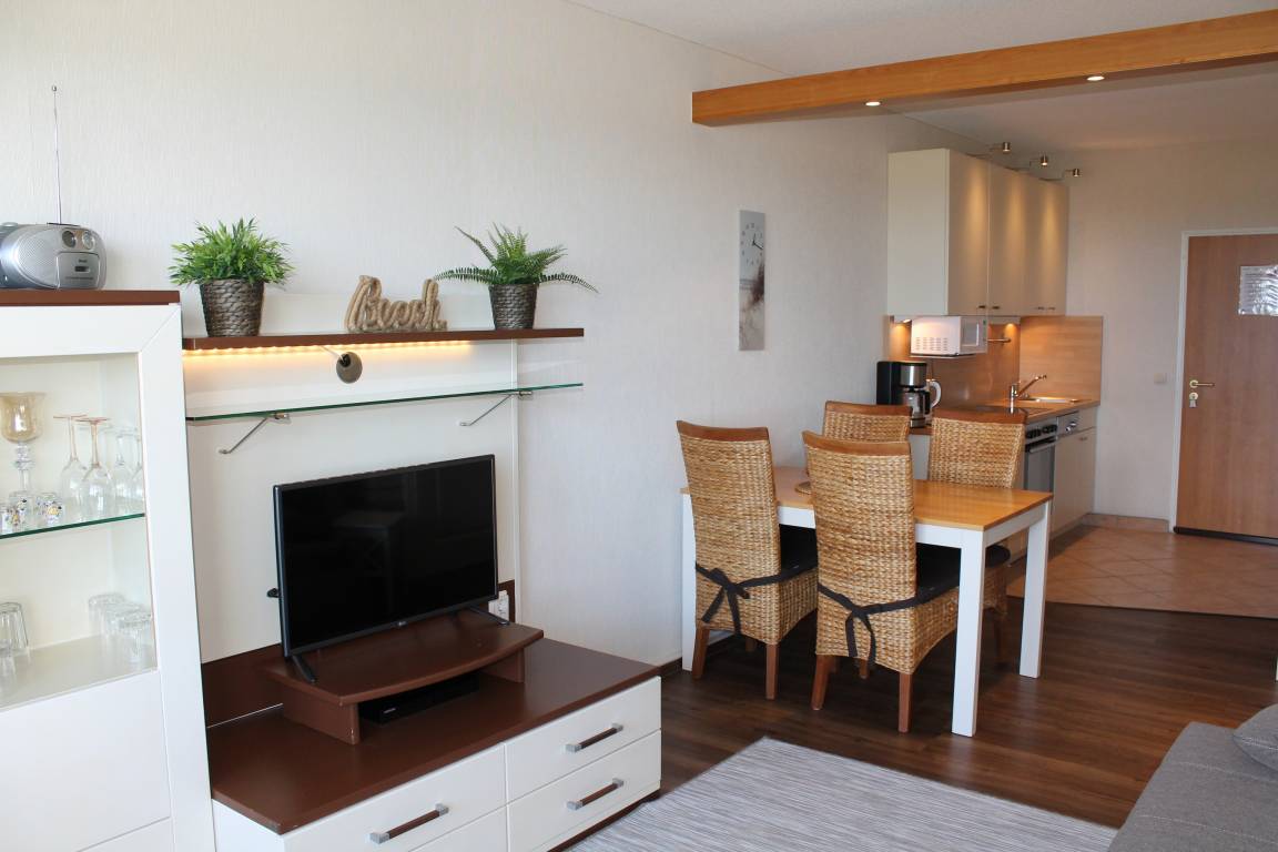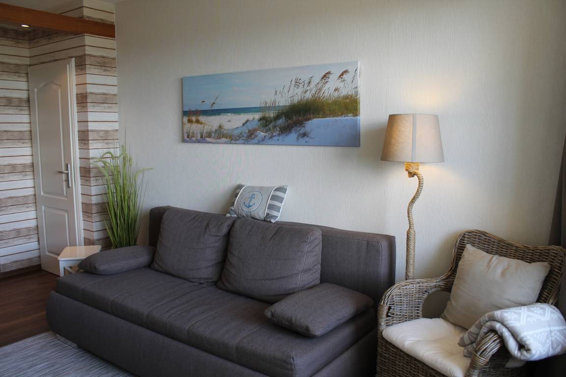 Im Wohnbereich befinden sich ein Sideboard mit Flachbild-Fernseher, DVD- Blu-ray Player, Radio mit CD-Player. Ein breites Sofa lässt sich mit wenigen Handgriffen in eine bequeme 1,60 x 2,00 Meter große Schlafcouch verwandeln.