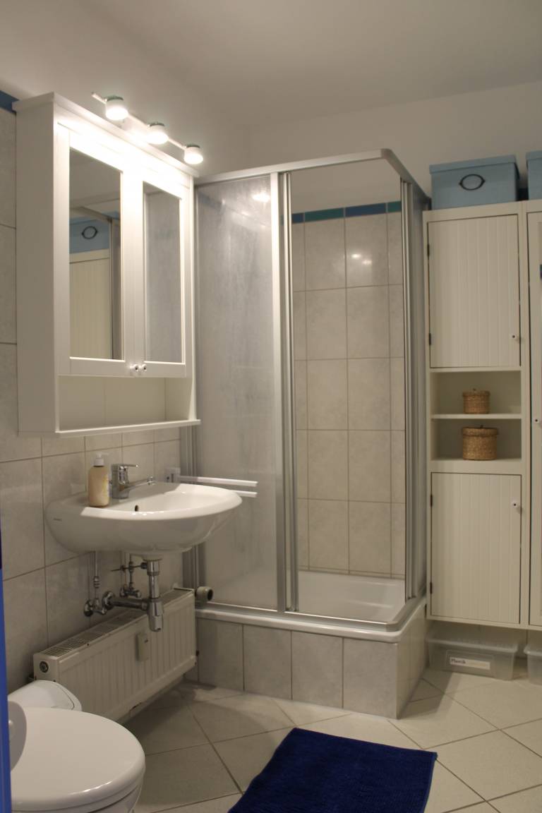 Im geräumigen Badezimmer mit Dusche und WC befinden sich ein großer Spiegelschrank mit Beleuchtung sowie ein weiterer Schrank und Wäschekorb. Waschmaschinen und Trockner können im Holmer Waschcenter gegen Gebühr genutzt werden.