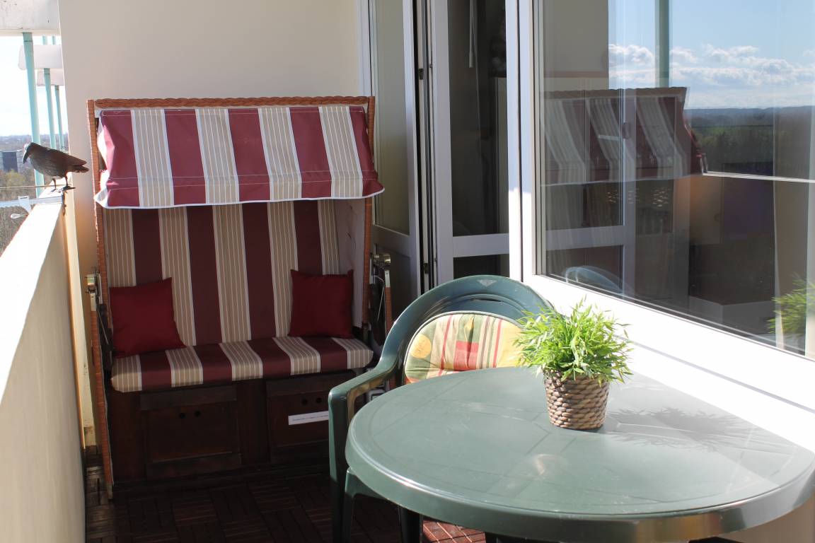 Auf dem großen überdachten Balkon mit Meerblick befindet sich neben einem Tisch mit 4 Stühlen auch ein Strandkorb mit Beleuchtung, auf dem man sich sehr gemütlich machen kann.