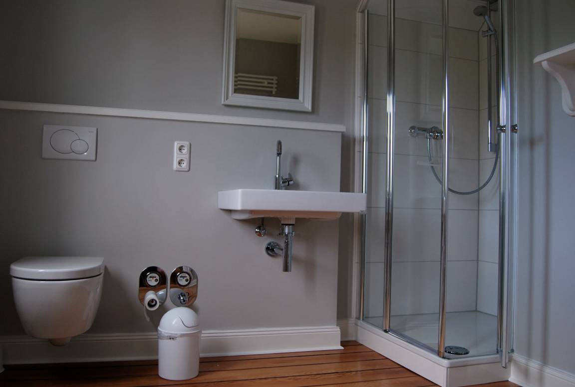 Ein weiteres Highlight dieses Appartements ist das Bad mit Holzdielenboden in Bootsoptik und einer Glasdusche.