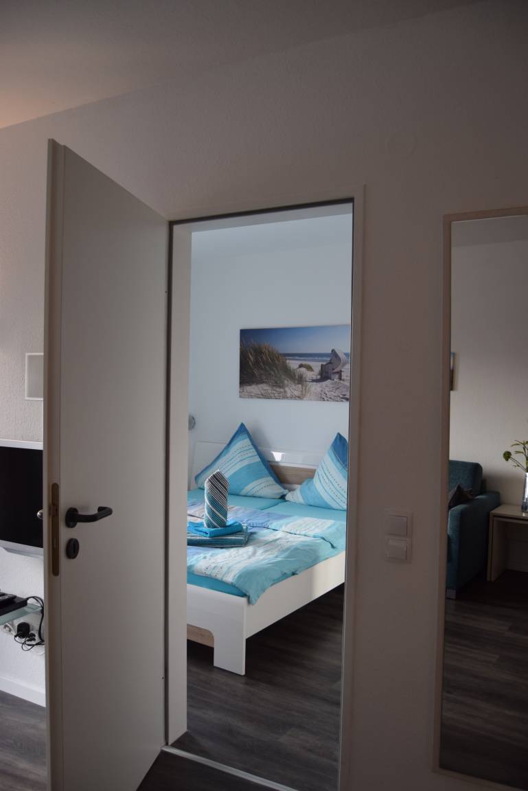 Das mit einer Tür vom Wohnzimmer abgetrennte Schlafzimmer ist mit einem gemütlichen Doppelbett (ca. 180 x 200 cm), Nachtschränken und einem großen Schrank (mit einem eingebauten kleinen Tresor) möbliert. Für Ihren Komfort sind Bettwäsche und Handtücher im Mietpreis inbegriffen. Zum Wäschepaket gehört jeweils ein großes Duschhandtuch, zwei Handtücher sowie eine Duschmatte und ein Geschirrhandtuch. Zusätzlich finden Sie ein Bügeleisen mit Bügelbrett vor.