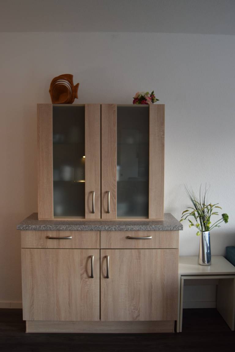 Unsere Küchenzeile besticht durch ihre moderne Optik, abgesetzt mit einer marmorierten Arbeitsplatte und einer entsprechenden Rückwand. Die Küche ist mit einem 2–Platten-Ceranfeld, einem Umluftbackofen auf Augenhöhe (mit versenkbarer Klappe), einem Kühlschrank mit ***Gefrierfach sowie einer Geschirrspülmaschine ausgestattet. Selbstverständlich sind eine Kaffeemaschine, ein Wasserkocher, ein Toaster und ein Mixer vorhanden. Geschirr, Besteck und Kochgeschirr ist in der passend zur Küchenzeile angefertigten Anrichte großzügig sortiert.