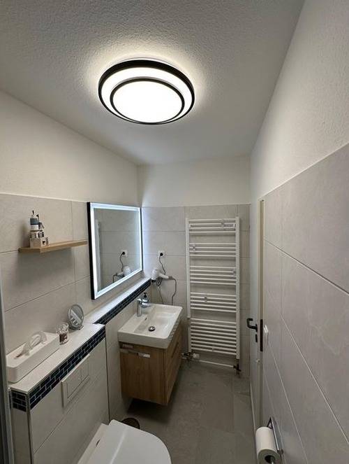 Das Badezimmer ist grau gefliest und mit weißen Sanitärartikeln ausgestattet. Der Waschbeckenunterschrank und das geflieste Sims bietet Ihnen ausreichend Stellfläche und Stauraum, der Handtuchheizkörper wärmt Ihr Handtuch vor. Selbstverständlich sind ein Fön sowie ein Kosmetikspiegel vorhanden.
