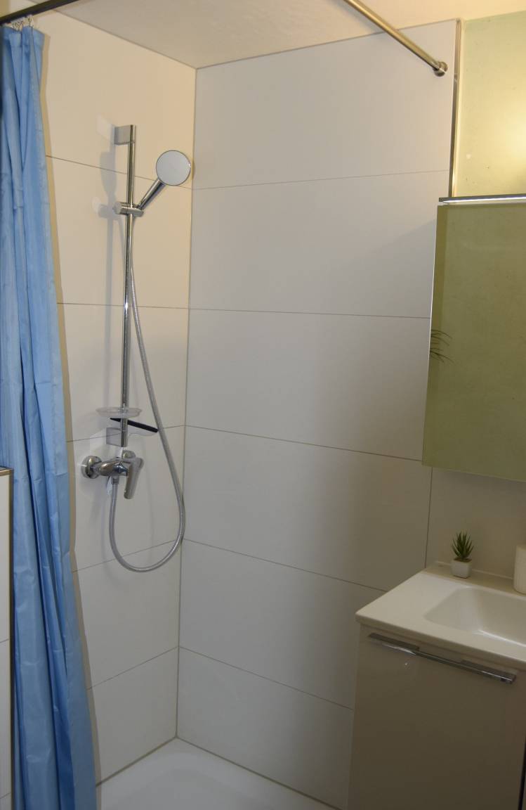 Für vier Personen bieten zwei Schlafräume ausreichend Platz, ergänzt durch ein modernes Bad mit Dusche.