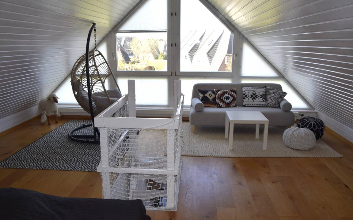 Dies erreichen Sie über die Raumspartreppe vom Wohnbereich aus. Der Loungesessel und ein weiteres kleines Sofa bieten genügend Möglichkeiten um sich zu entspannen, ein gutes Buch zu lesen oder einfach nur mal nix zu tun.