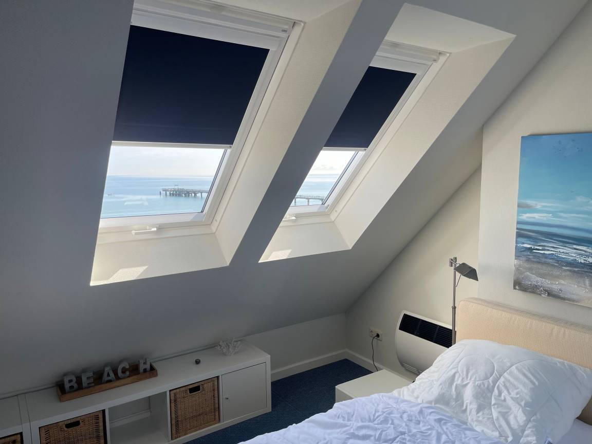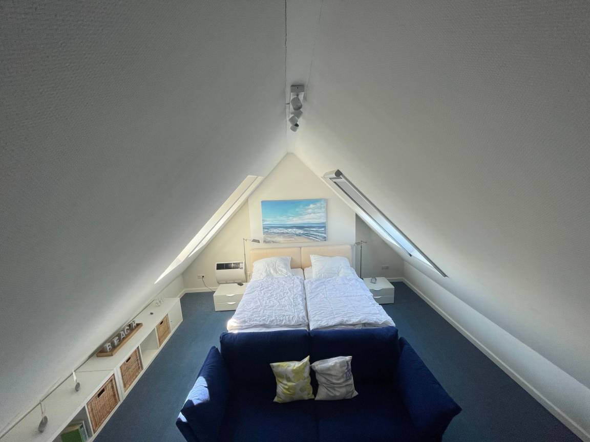 Schlafzimmer (DG): 1 Doppelbett (2x 90x200 cm), Verdunkelung: Plissees), Platz für ein Babybett