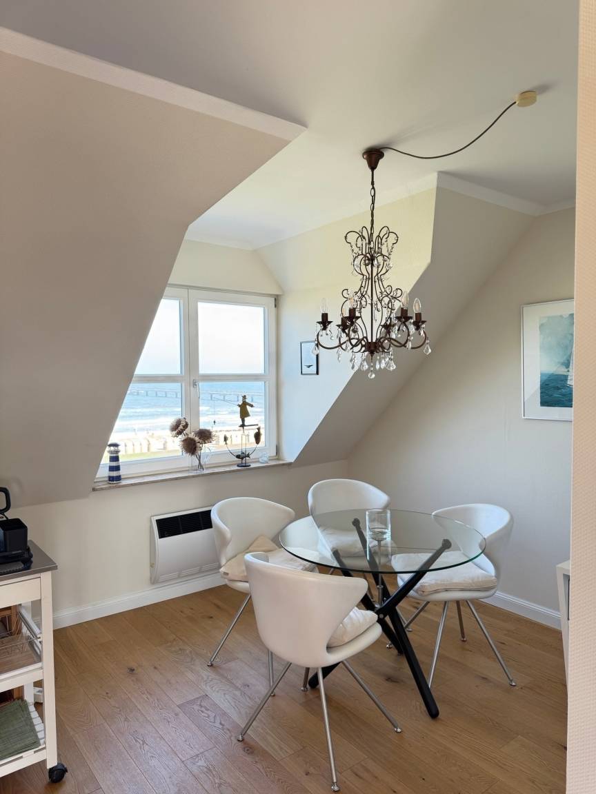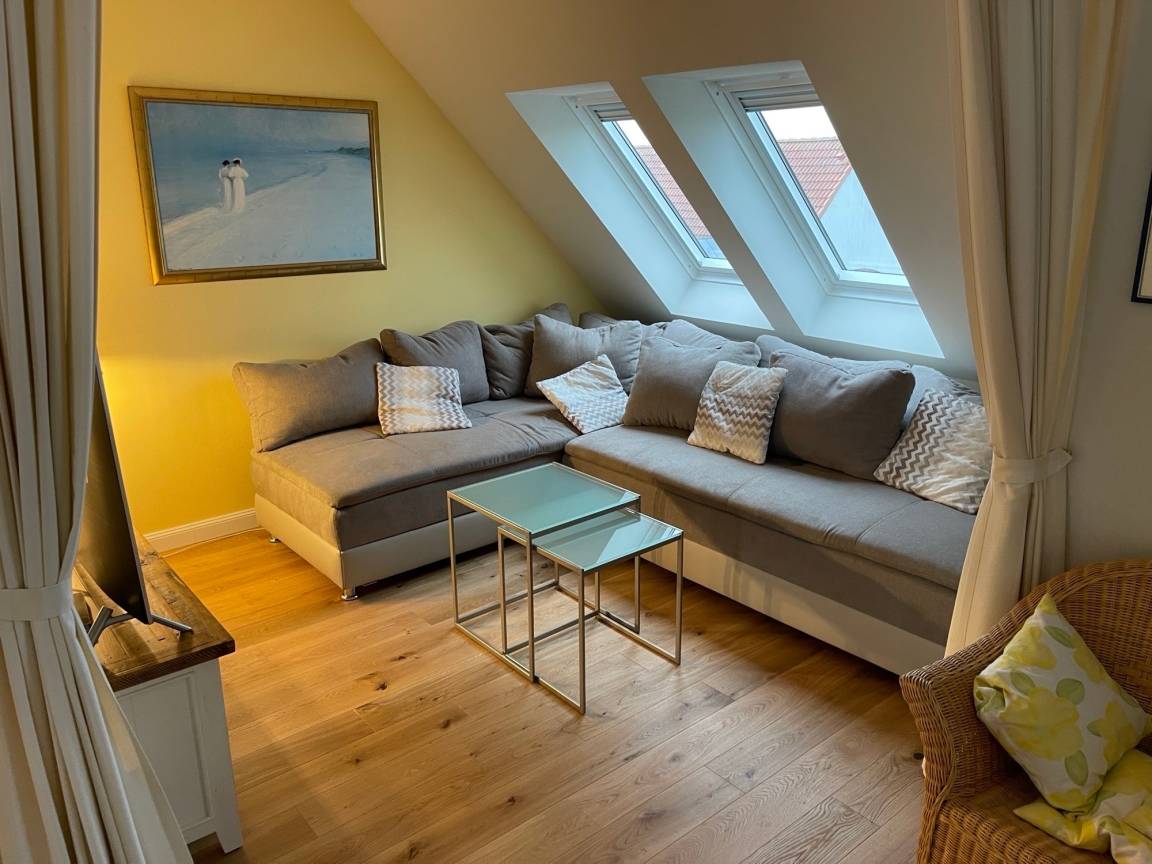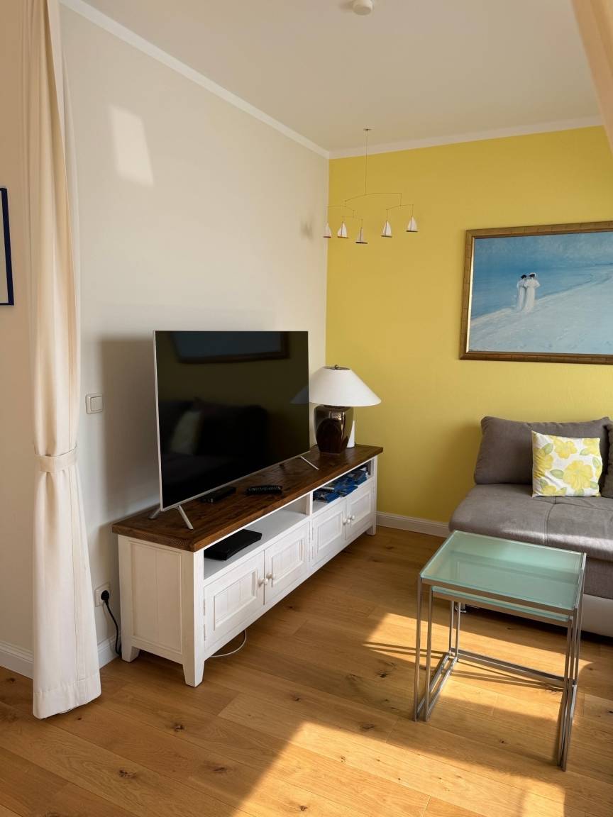 Der helle Wohnbereich lädt mit einem gemütlichem Schlafsofa zum Entspannen ein und bietet dank der strandnahen Lage einen herrlichen Ausgangspunkt für erholsame Tage am Meer. Die offene Küche ist bestens ausgestattet mit Backofen, Ceranfeld, Mikrowelle, Kühlschrank sowie Kaffeemaschine (Filter und Kapsel), Wasserkocher, Eierkocher und Toaster – ideal für gemeinsame Mahlzeiten. Im separaten Schlafzimmer erwartet Sie ein komfortables Doppelbett für erholsame Nächte. Das moderne Badezimmer verfügt über Dusche, WC, Fußbodenheizung, beheizbaren Handtuchhalter sowie einen Haartrockner.