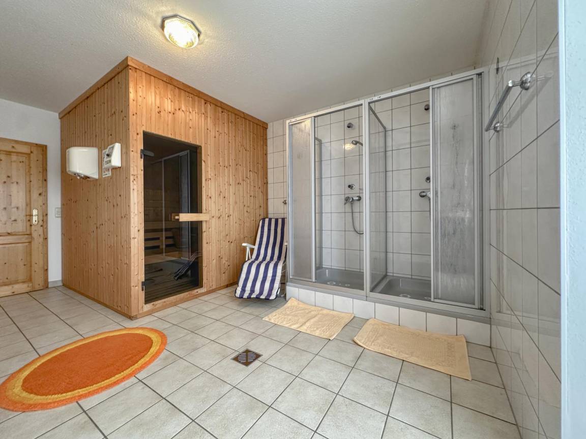 Souterrain: Aufenthaltsraum mit 5x Esstisch(4 Personen), 1x Hochstuhl , Küche mit Wasserkocher, Toaster, Kochherd(4 Kochplatten, Ceranfeld), Dunstabzugshaube, Kaffeemaschine(Filter), Backofen, Mikrowelle, Geschirrspüler, Kühlschrank(+ Gefrierfach), Zitruspresse , Saunaraum mit Dusche, Sonnenbank / Solarium, Sauna(gegen Gebühr, 10 Personen)