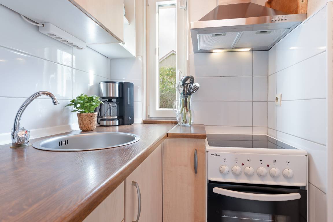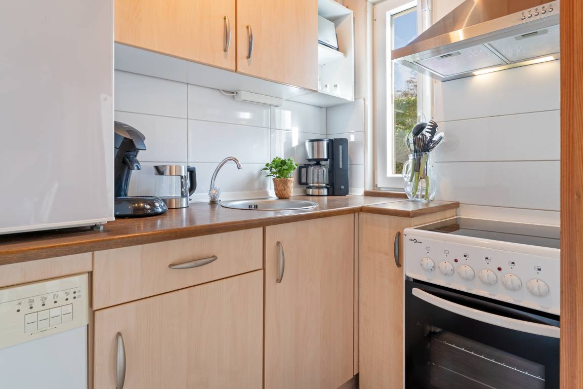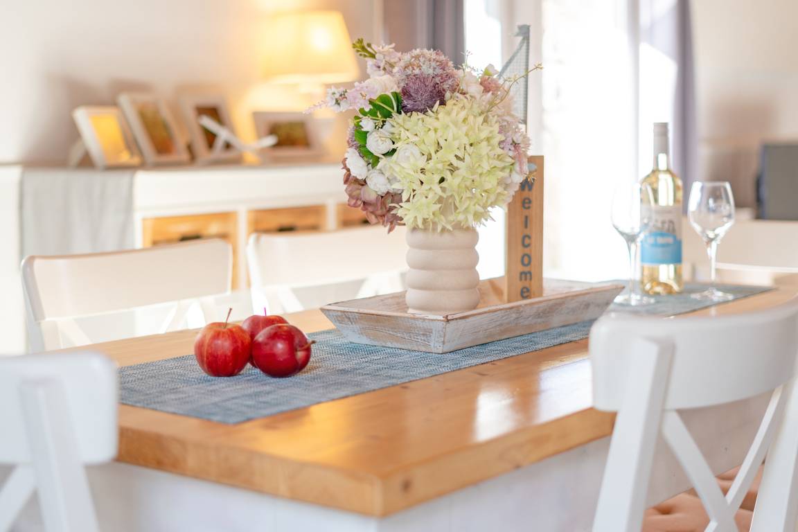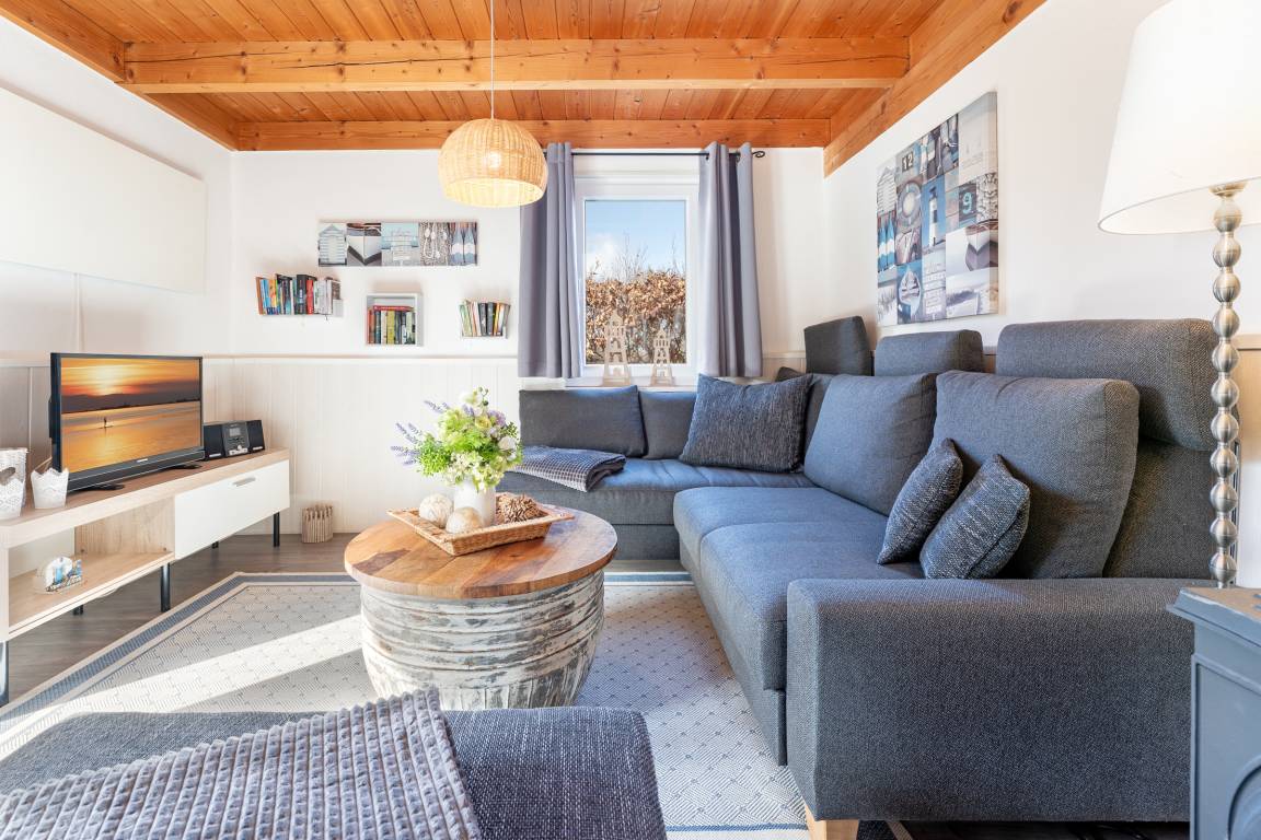 Der Rundgang beginnt im gemütlichen Wohnbereich, der mit einem Fernseher, Kamin und CD-Player ausgestattet ist und eine behagliche Atmosphäre schafft. Ihnen stehen zwei Terrassen zur Verfügung. Eine mit West- und eine mit Ost-Ausrichtung, jeweils mit 12cm Schwelle, die mit Gartenmöbeln, Sonnenschirm und Sonnenliegen zum Entspannen einladen. Das Grillen ist erlaubt. Weiter geht es in die voll ausgestattete Küche, in der sie sich optimal in Ihrem Urlaub versorgen können. Im angrenzenden Essbereich genießen Sie gemeinsame Mahlzeiten.