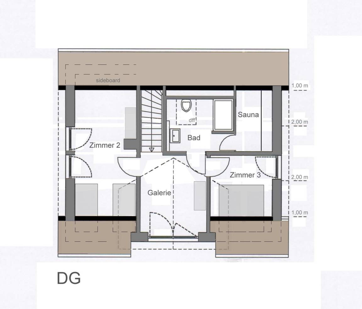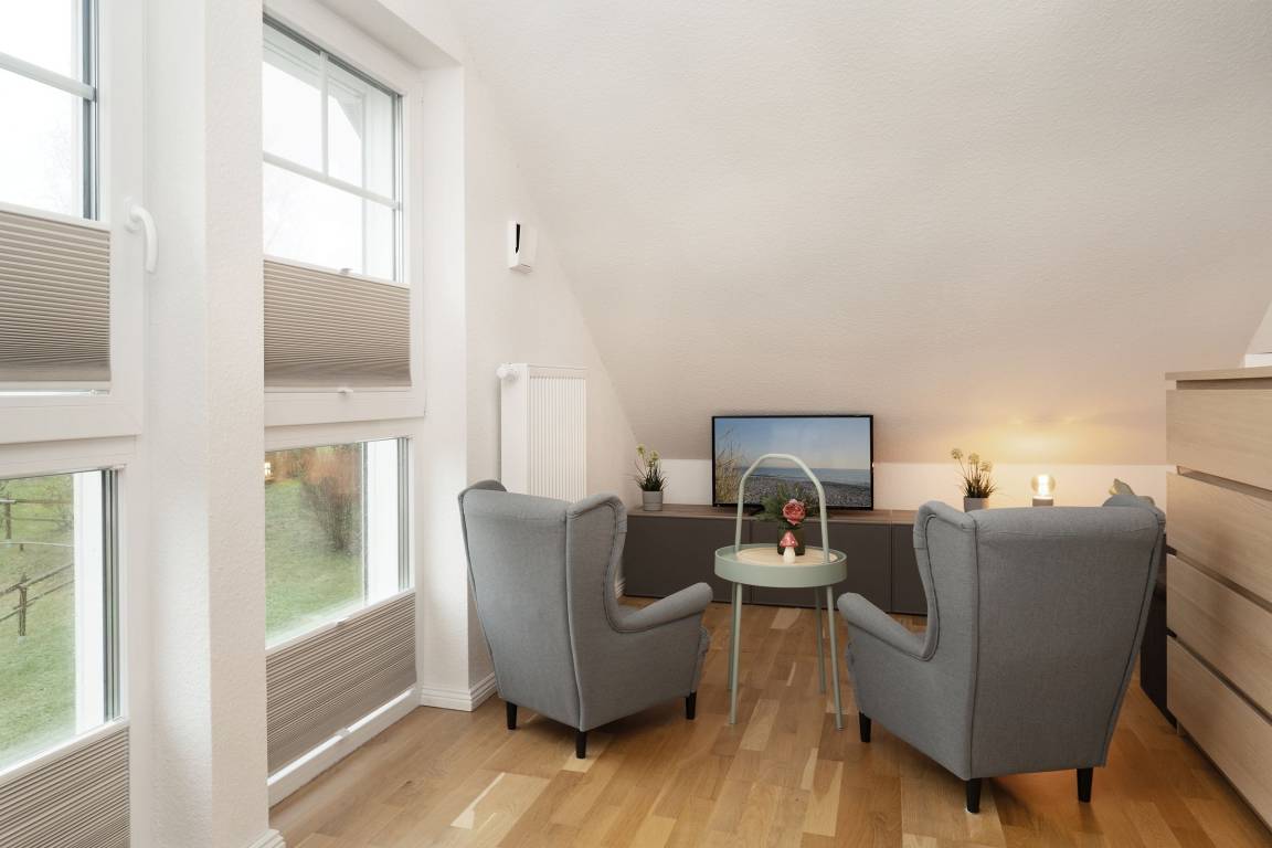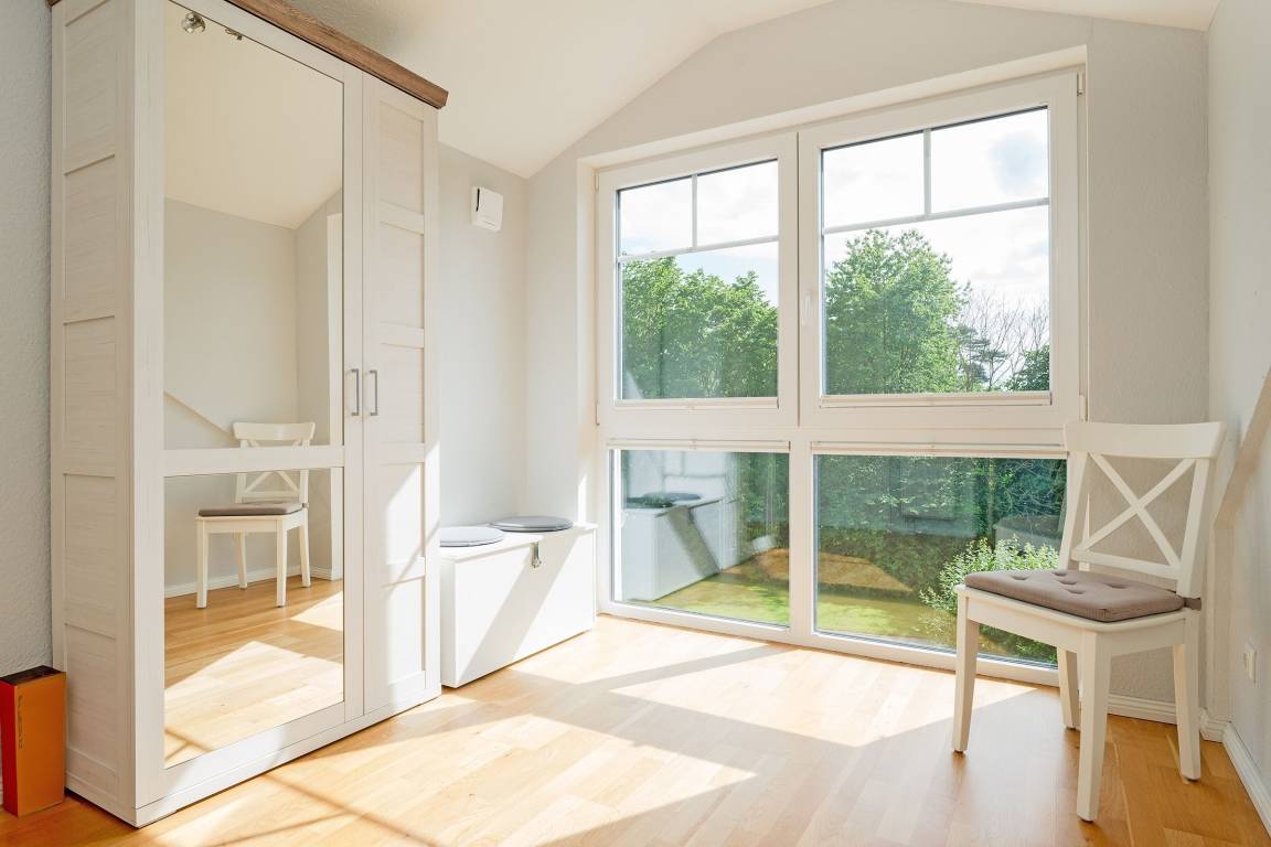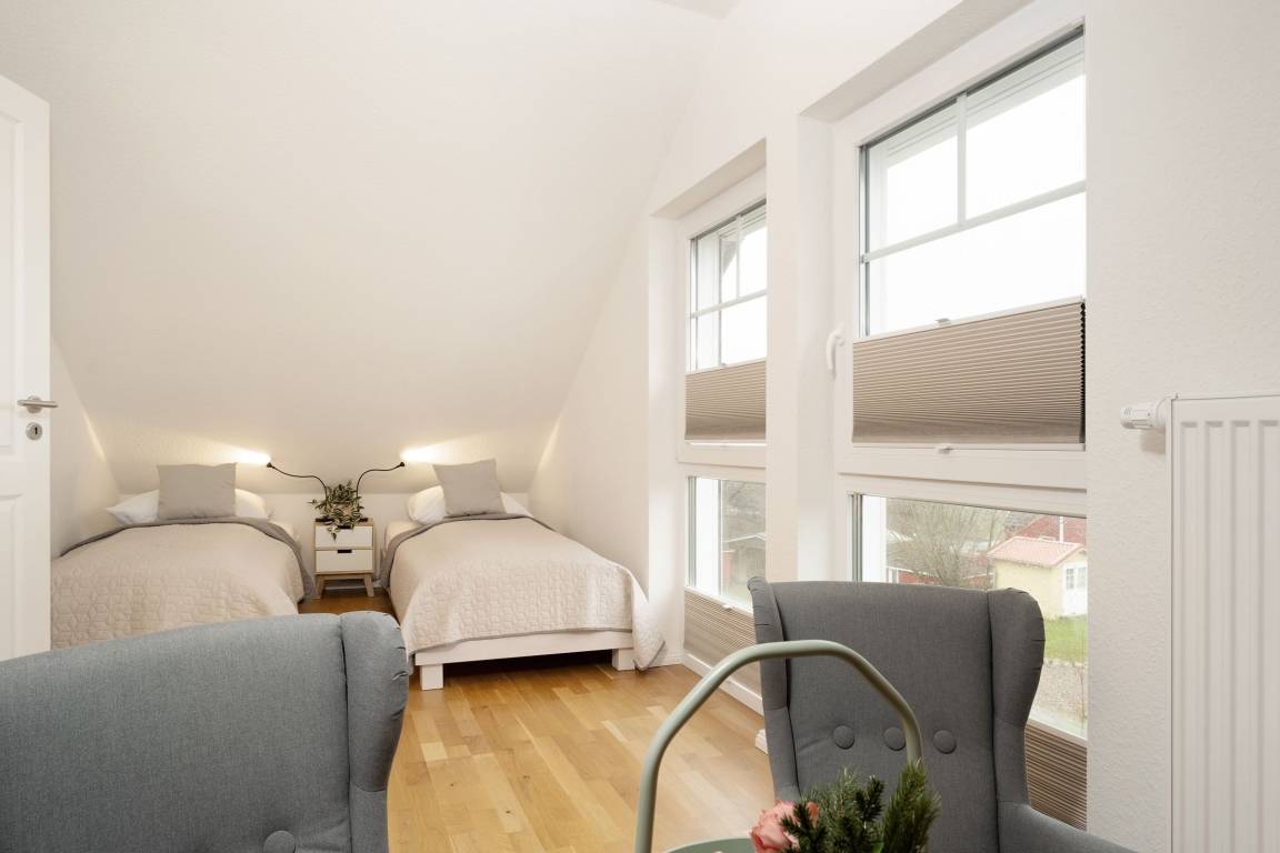 2. Schlafzimmer im DG: 2 Einzelbetten (je 90x200 cm), Kleiderschrank, Verdunkelung: Rolladen, kein Platz für ein Babybett, zwei kleine Sessel