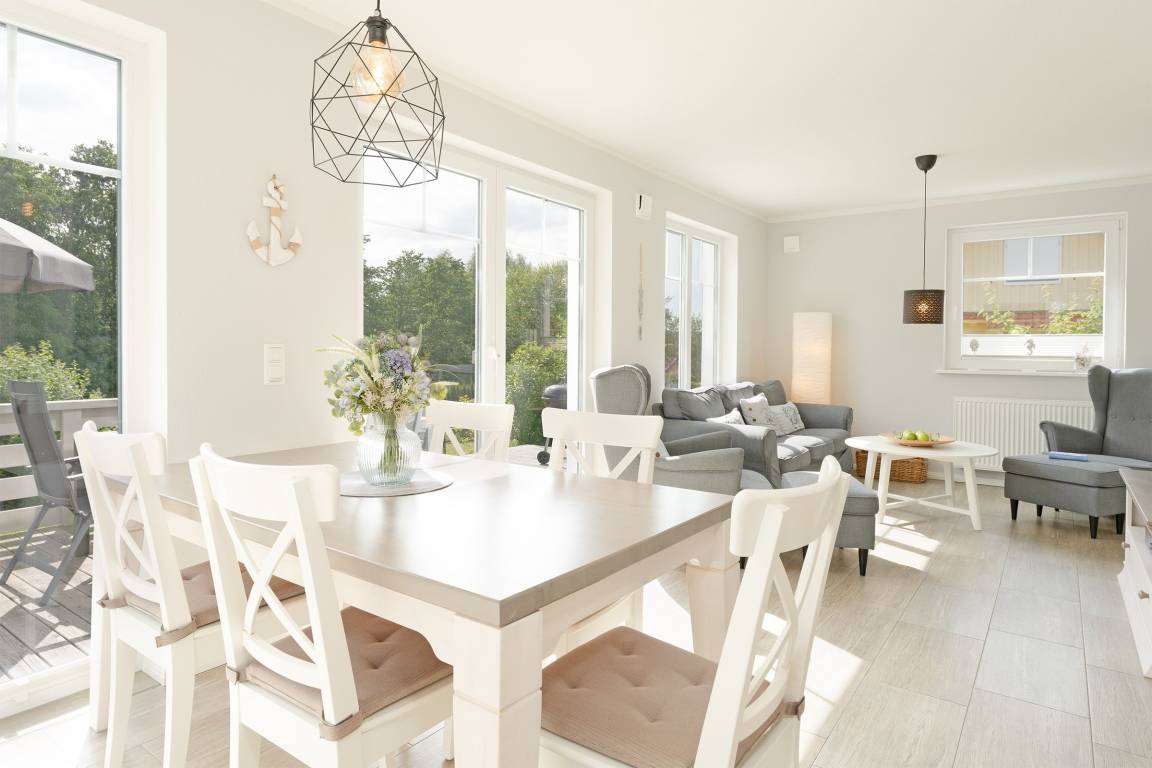 Das zauberhafte Haus bietet viele Möglichkeiten. Treten Sie ein, die schicke Einrichtung wird Sie überzeugen: In der gemütlichen Sessel- und Sofalandschaft findet jeder seinen Lieblingsplatz. Auch die großzügige, möblierte Terrasse lädt zum Verweilen ein. Die offene Küche ist mit Extras wie Espressomaschine (Senseo) und Geschirrspüler ausgestattet. Für die Nacht stehen Ihnen drei Schlafzimmer zur Verfügung: Eins im EG mit einem Doppelbett (140x200 cm) und zwei im OG: davon eins mit 2 Einzelbetten (je 90x200 cm) und eins mit einem weiteren Doppelbett (2x 80x160 cm). Gleich zwei Duschbäder komplettieren das Angebot in diesem Feriendomizil und werden Sie entspannt in den neuen Tag bringen.