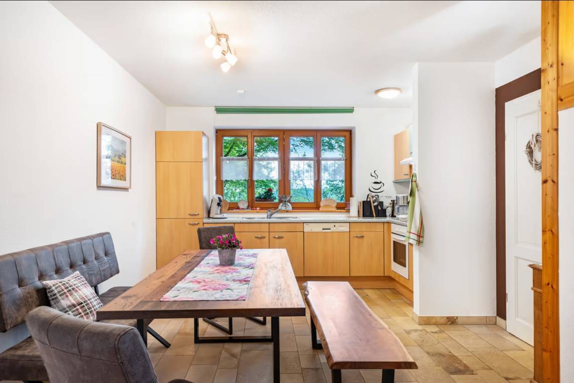 Richtige Urlaubsstimmung kommt auf der schönen Terrasse der Ferienwohnung auf. Die gut ausgestattete Küche besitzt unter anderem einen Kühlschrank, einen Herd zum Kochen und sogar eine Spülmaschine.