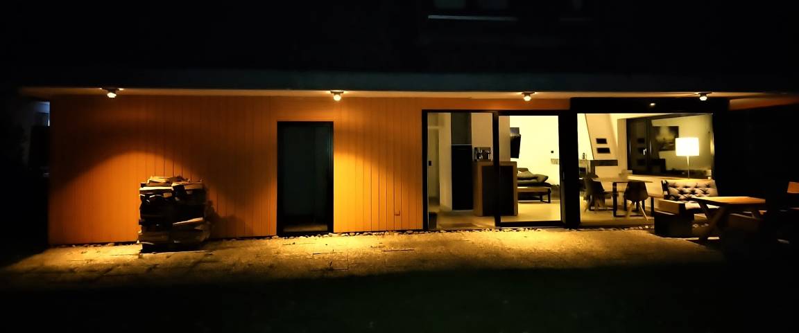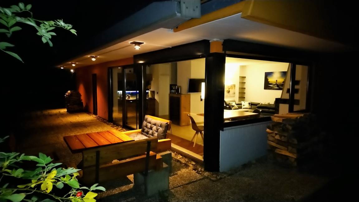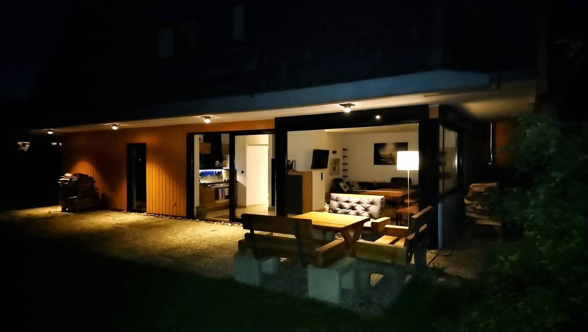 Der Garten, sowie die 2 Terrassen sind ebenerdig über Panorama Glastüren begeh- und nutzbar. Der Wohnbereich ist mit Natursteinboden ausgestattet.