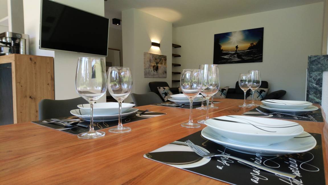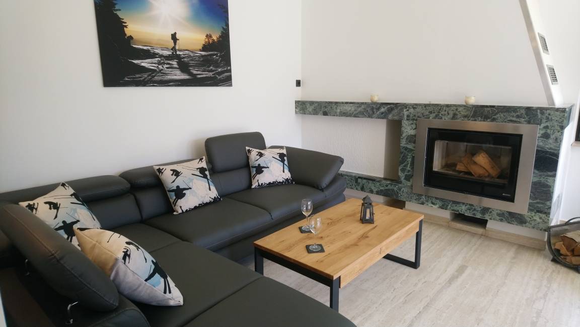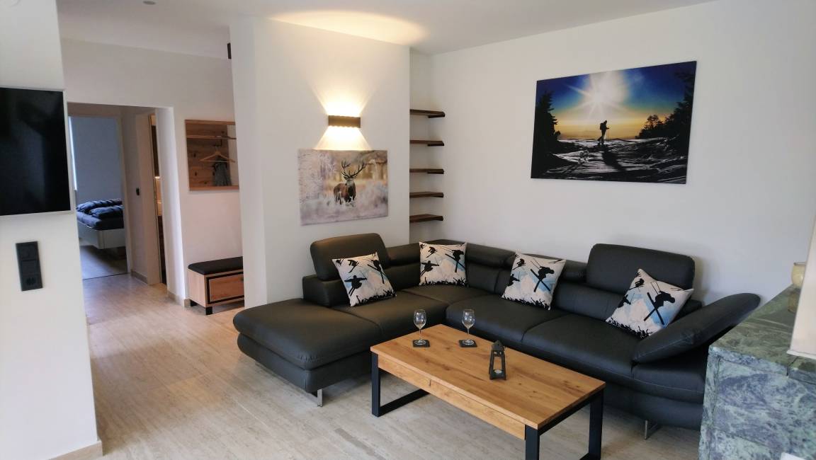 Moderne Apartmentkombination für maximal 6 Personen mit drei Schlafräumen, zwei Bädern, Wohnzimmer mit offenem Küchen/Essbereich sowie einem Kamin.