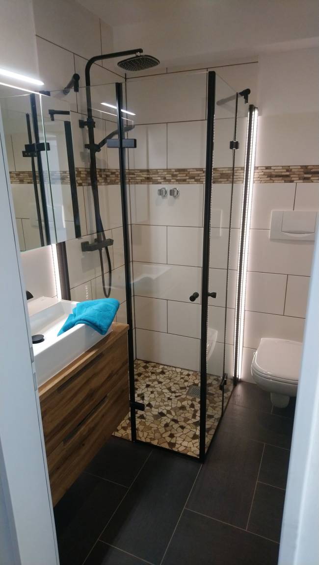 Die Apartmentkombination setzt sich aus einem 2, sowie einem 4-Personen apartment zusammen. Beide Apartments befinden sich im Erdgeschoß und sind über Treppenstufen (ca. 1m Höhe) miteinander verbunden.