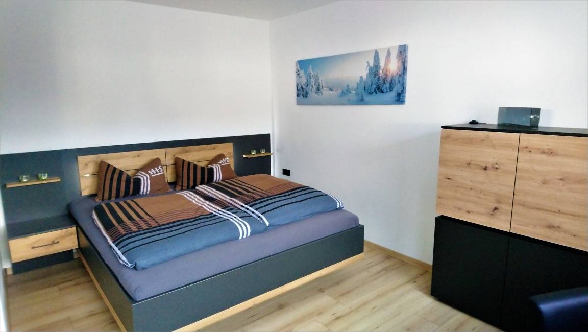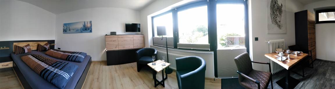 Modern eingerichtete Ferienwohnung mit einem Bad, Flur, Wohn/Schlafzimmer sowie offenem Küchen/Essbereich.