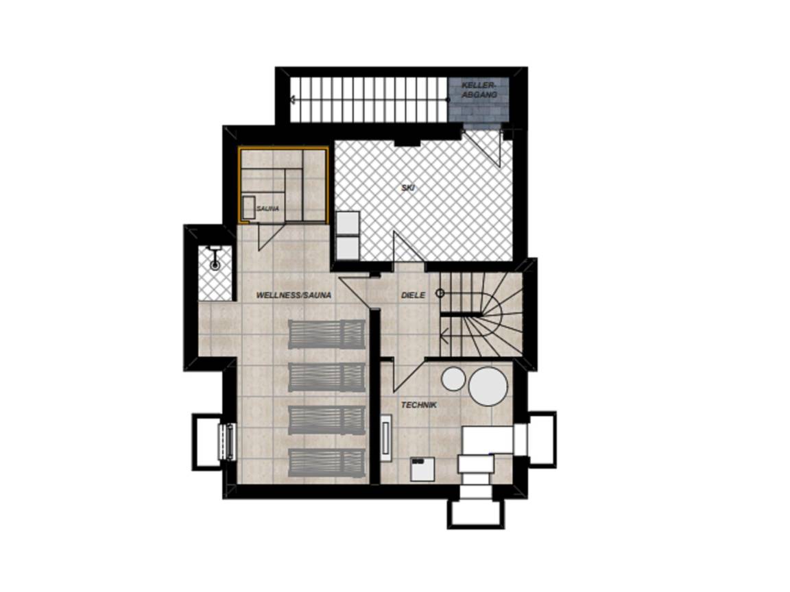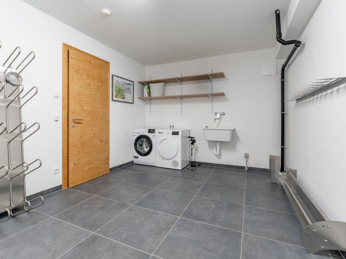 Keller: Ruheraum mit Dusche, Sauna(alleinige Nutzung, 4 Personen) , Skiabstellraum mit Skischuhheizung , Wäschetrockner, Waschmaschine, Staubsauger, 4x Liegestühle