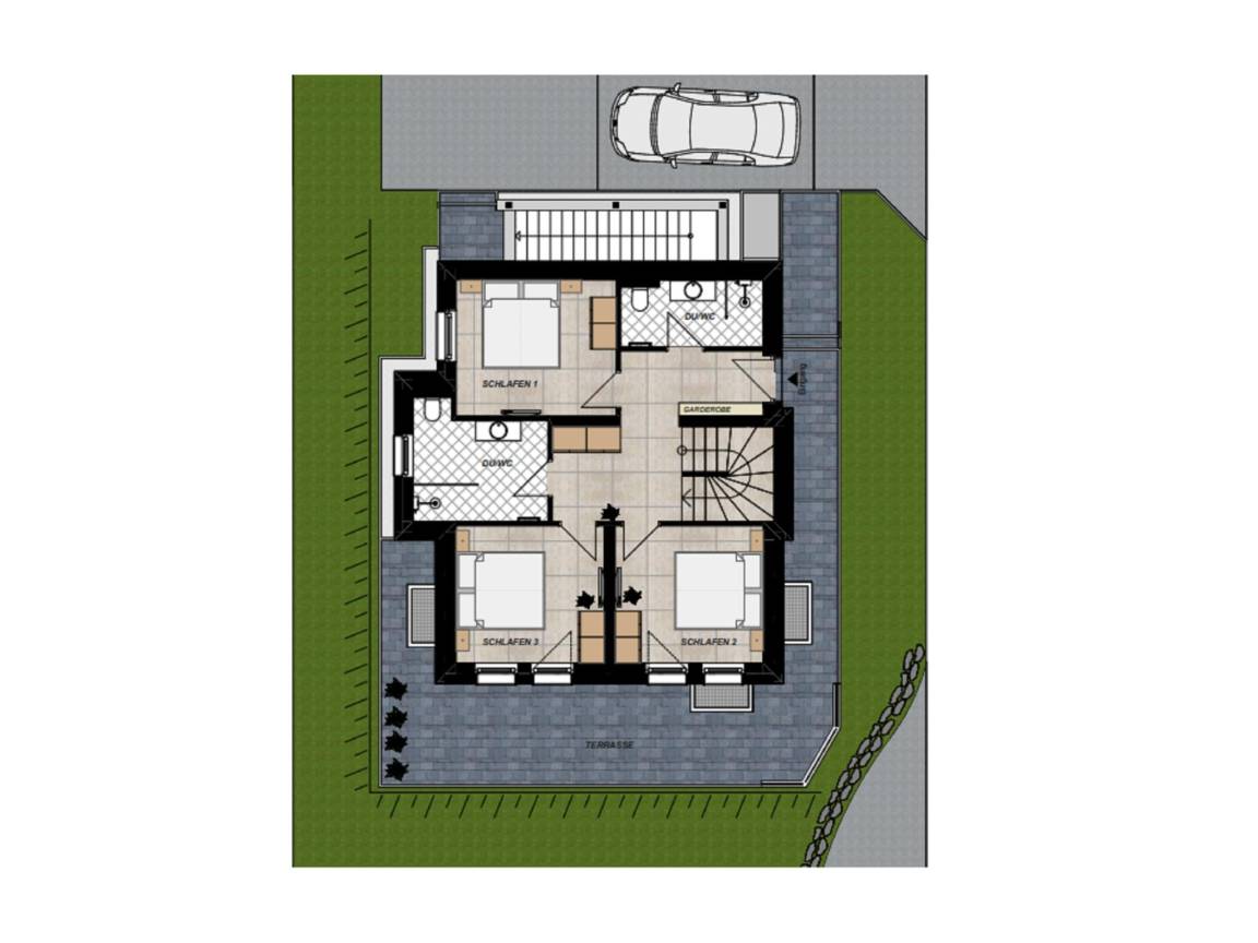 Layout : Parterre: Eingang, Diele, Schlafzimmer mit 2x Etagenbett, TV , Schlafzimmer mit Doppelbett, TV , Schlafzimmer mit Badezimmer mit Doppelbett, TV, Dusche, 2x Waschbecken, Toilette, Föhn , Badezimmer mit Dusche, 2x Waschbecken, Toilette, Föhn , Terrasse(32 m²), 2x Parkplatz