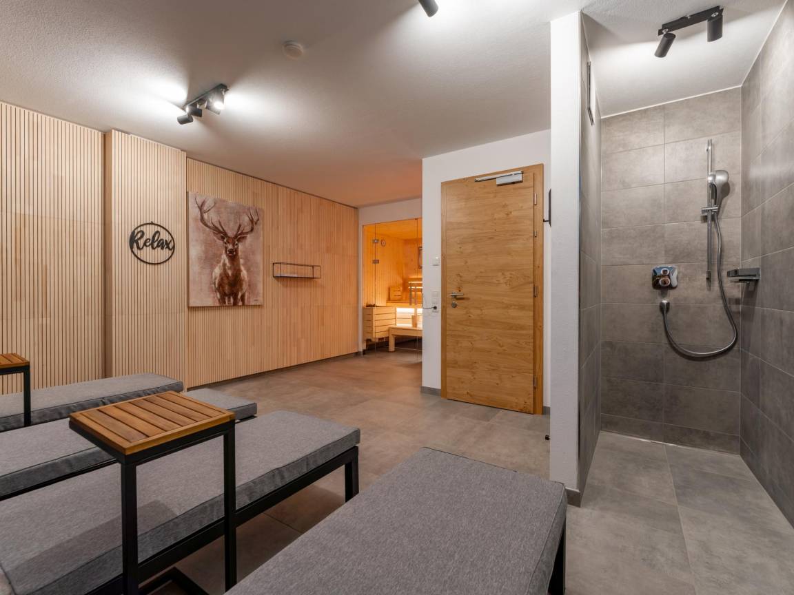 Keller: Ruheraum mit Dusche, Sauna(alleinige Nutzung, 4 Personen) , Skiabstellraum mit Skischuhheizung , 4x Liegestühle